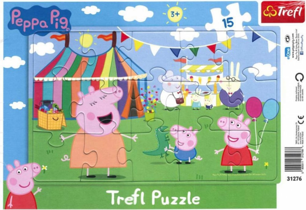 Deskové puzzle V zábavním parku s motivem prasátka Peppiny, obsahuje 15 dílků. Kartónová podložka usnadňuje ukládání a rámeček zabezpečuje, aby se obrázek nerozsypal. Skládačka na desce.