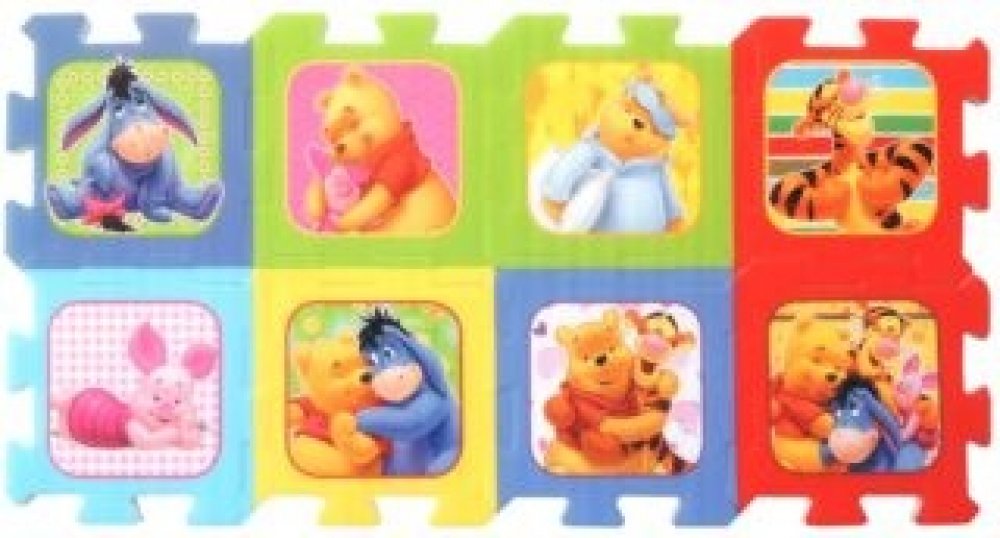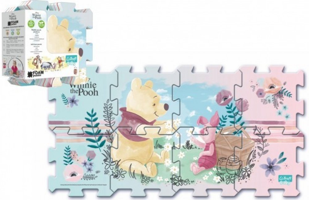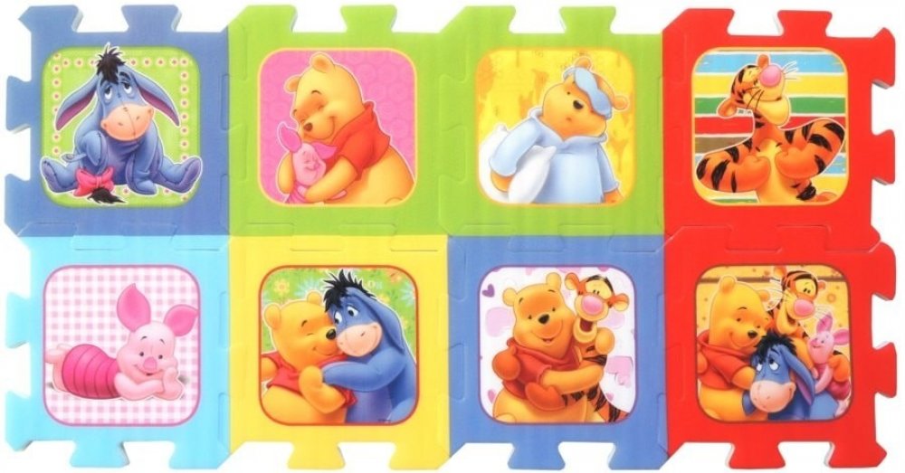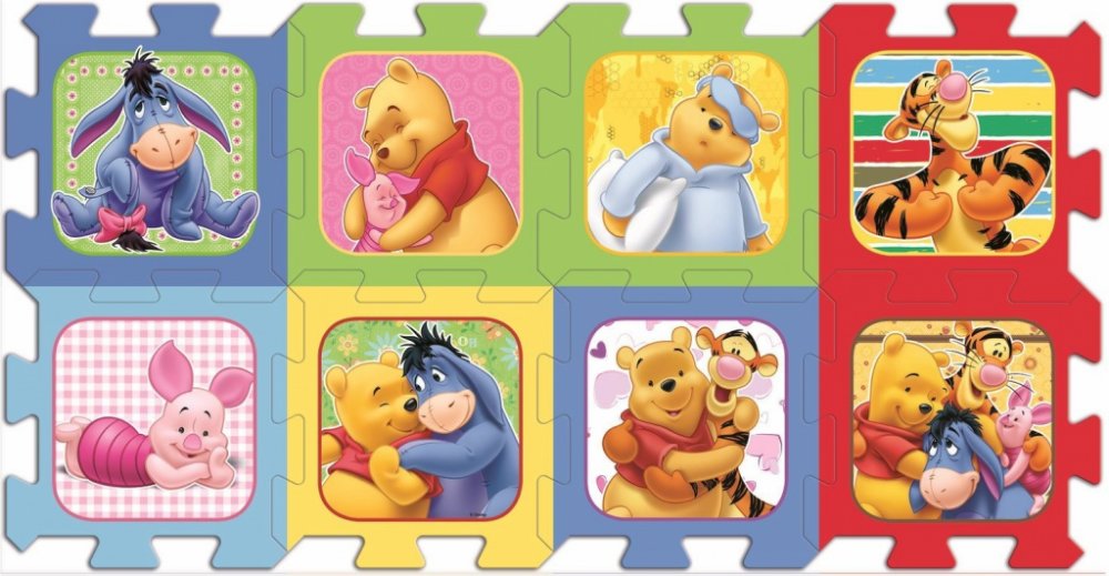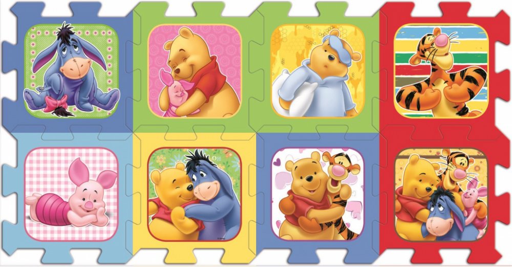 Pěnové puzzle s barevnými obrázky Medvídka Pú, Tygra, Prasátka a Ijáčka.