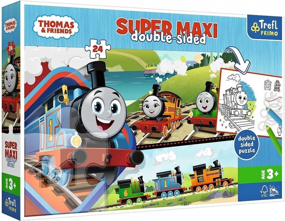 Velké oboustranné puzzlepodporují vývoj dítěte a poskytují tak spoustu skvělé zábavy.Na jedné straněje zde mimořádně barevný obrázek s pohádkovými postavami - vláčky, na dalších dvou aktivitách - omalovánka a hledání způsobem. Prvkyskládačkyjsou velké, takže jsou skvělé pro malé dětské ručičky.