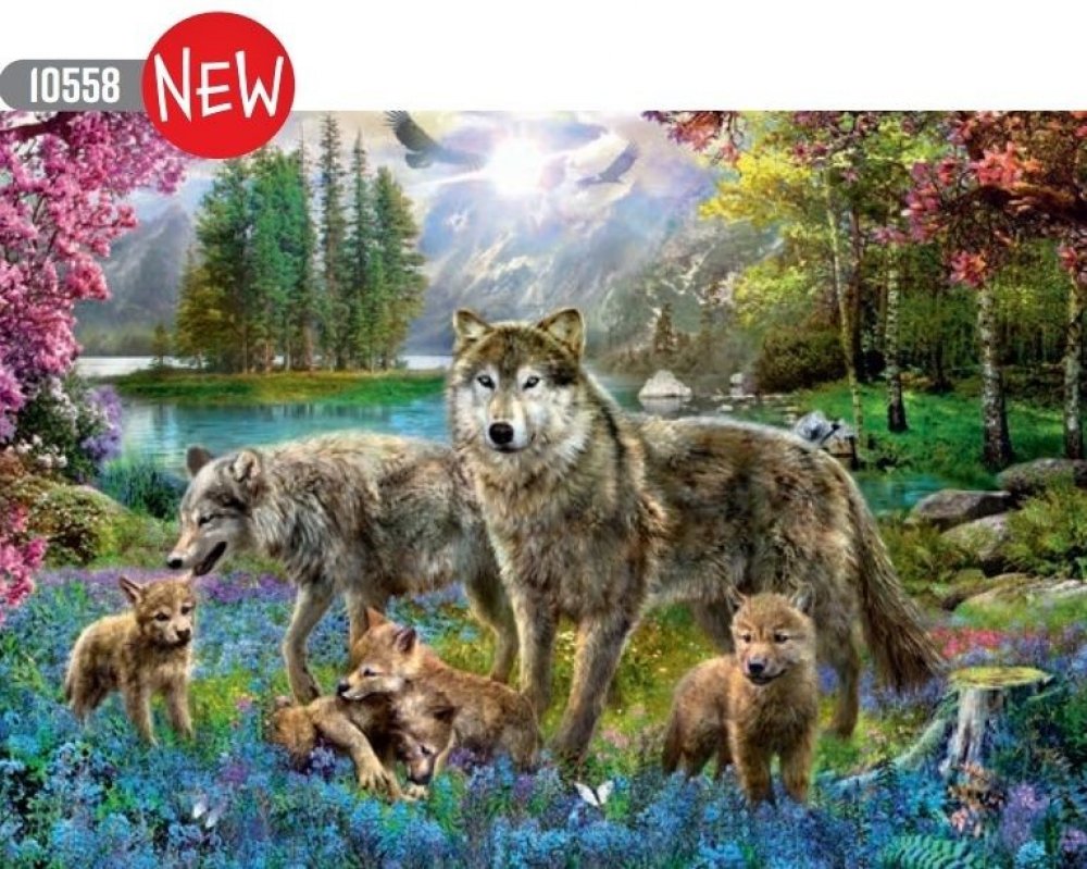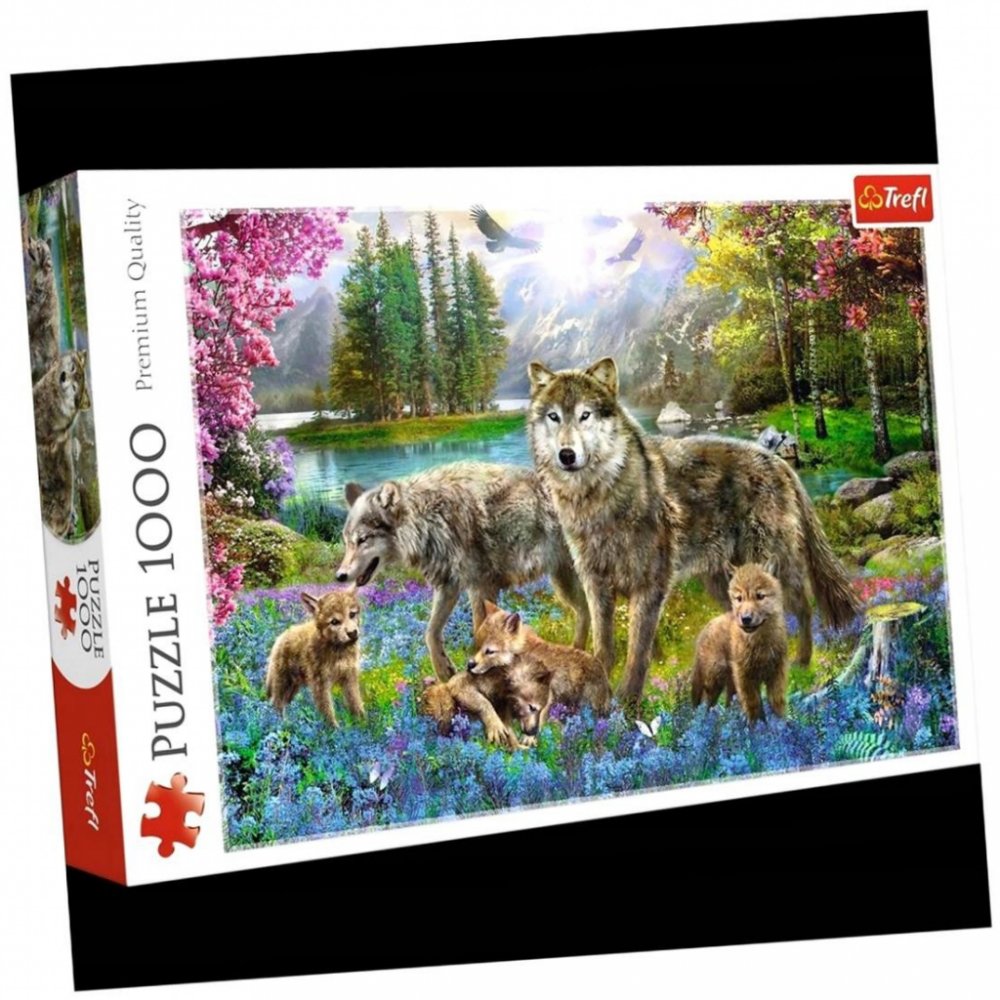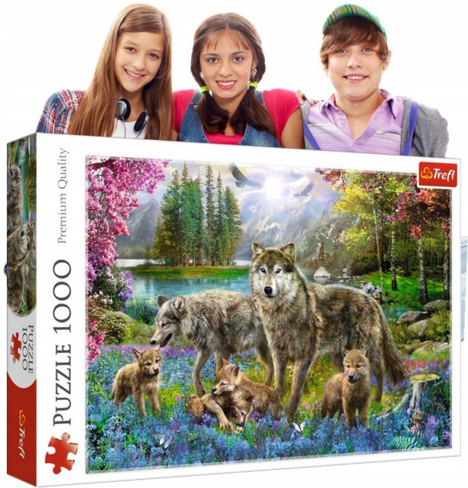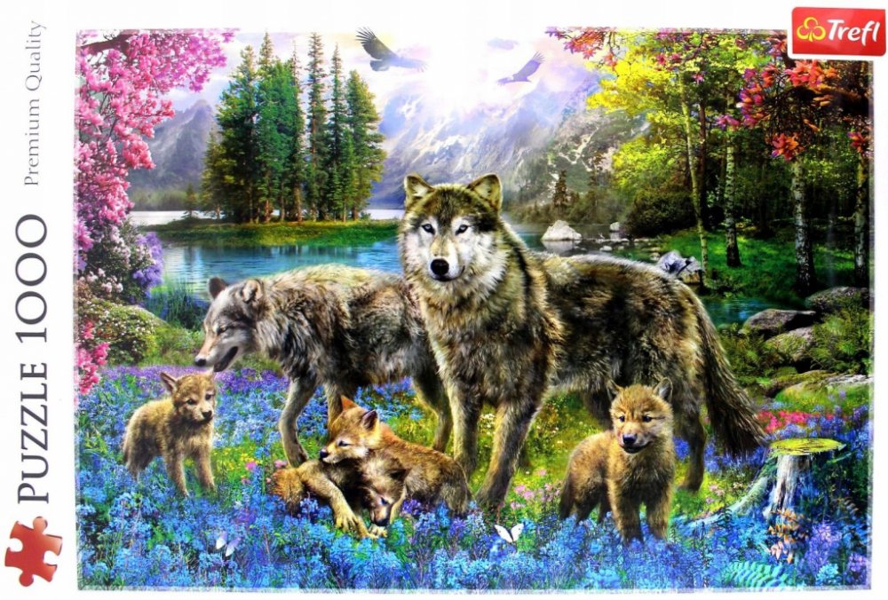 Sada skládaček se skládá z 1000 dílků a umožňuje sestavit mimořádně pestrý obrázek, který znázorňujerodinu vlků na rozkvetlé lesní mýtině.