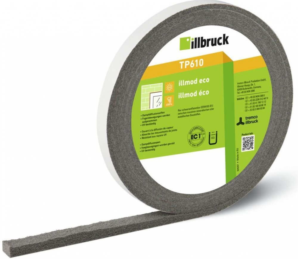 TP610 illmod eco - ILLMOD COMPRI Předstlačená samolepící páska illbruck Předkomprimovaná páska illmod eco slouží k utěsnění proti průchodu vody u spár a napojení při montáži oken, při výstavbě zděných konstrukcí, fasádních systémů a v dřevo- a kovo- zpracujícím průmyslu. Okenní těsnicí páska určená pro rychlou, kvalitní utěsnění připojovací spáry oken a balkónových dveří. Utěsněná spára je vodotěs...