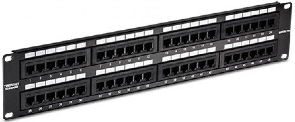Nestíněný, 48 portový patchpanel kategorie 5e pro montáž do 19“ rozvaděče (výška 2U).;