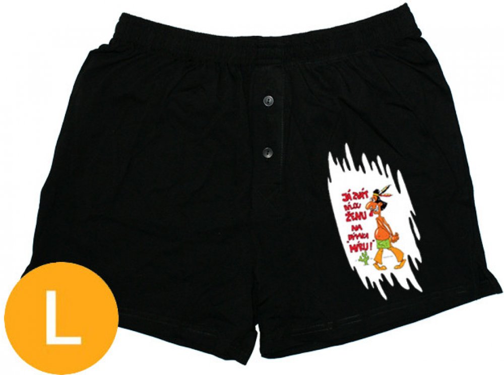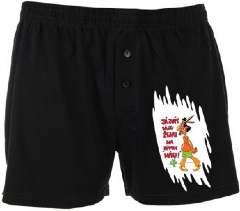 Pánské trenýrky Dýmka míru - velikost XXXL jsou vtipné černé bavlněné trenýrky vhodné pro muže všech věkových kategorií. Na trenýrkách je obrázek indiána a vedle něj vtipný text "Ja zvát bílou ženu na dýmka míru!". Erotický a praktický dárek k svátku pro každého chlapa.