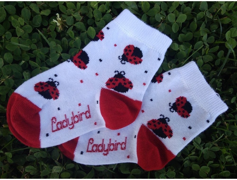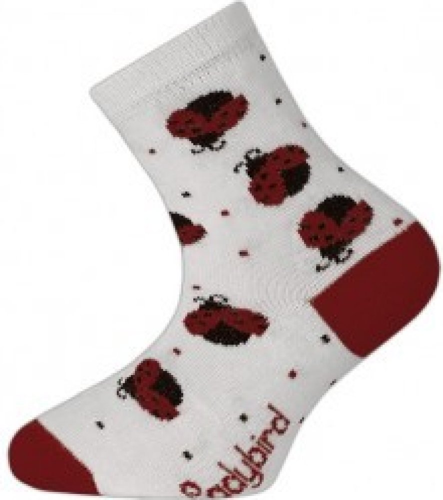 Dětské bílé ponožky s motivem berušek. Originalita, pohodlí, styl. Kousek s nápaditým vzorem, který stojí za oživení dětského outfitu. Ponožky jsou vyrobeny z jemné bavlny a díky přidanému elastanu se skvěle přizpůsobí tvaru dětské nohy. Mají řetízkovanou špičku a komfortní lemy, které se nezařezávají. Špička a pata ponožek jsou zesílené.Složení: 80% Bavlna, 18% Polyamid, 2% ElastanPorovnání velikostí: