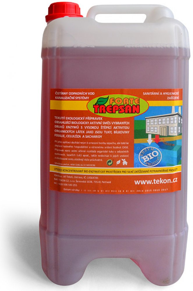 Trepsan forte je silný koncentrát směsi vybraných druhů enzymů se zvýšenou štěpící aktivitou organických látek jako jsou tuky, bílkoviny, fekálie, celulosa, sacharidy apod. Vyrábí se speciálním technologickým postupem. Výsledkem je kapalina obsahující směs proteolytických, amylolytických, celulolytických a lipolytických enzymů, která dokonale vyhovuje uvedeným účelům. Výrobek není toxický, je biologicky odbouratelný a šetří životní prostředí.Přednosti přípravku TREPSAN:výrazně snižuje zápach odpadních vod i celých systémůzlepšuje kalové hospodářství – podporuje separaci kalurozpouští a uvolňuje tukové a další nánosy v odpadních systémech a brání tvorbě úsad, což představuje podstatné omezení havarijních situací i mechanického čištění systémůomezením usazenin v odpadních systémech eliminuje výskyt hlodavcůněkolikanásobně prodlužuje dobu vývozu jímky, žumpy či septikuNávod k použití: Přípravek se dávkuje nejlépe na vstupu do odpadního systému (vpusť apod.). Trepsan Forte se ihned naváže na usazeninové nečistoty. Protékající voda proto výrazněji nesnižuje jeho účinnost. Postupně dochází k uvolnění usazenin už v kanalizaci a zároveň k promíchání obsahu na přítoku.Dávkování v potravinářských provozech,vyvařovnách apod. , případě havarijního stavu - ucpávání odpadního systému doporučujeme dávkovat: 1x denně 0,2 - 0,3 l do každé zatěžované vpusti až do odstranění problému (cca.týden). Pak snížíme dávkování na udržovací dávky, což představuje cca.50% dávkování.Doporučené dávkování pro ČOV: 1:100 až 1:300m3 (Trepsan Forte: množství odpadní vody/24hod - dle problémů)