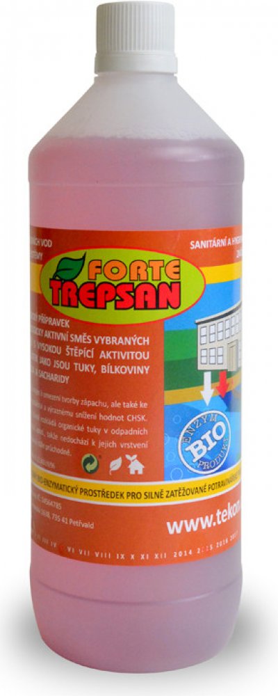 Trepsan forte je silný koncentrát směsi vybraných druhů enzymů se zvýšenou štěpící aktivitou organických látek jako jsou tuky, bílkoviny, fekálie, celulosa, sacharidy apod. Vyrábí se speciálním technologickým postupem. Výsledkem je kapalina obsahující směs proteolytických, amylolytických, celulolytických a lipolytických enzymů, která dokonale vyhovuje uvedeným účelům. Výrobek není toxický, je biologicky odbouratelný a šetří životní prostředí.Přednosti přípravku TREPSAN:výrazně snižuje zápach odpadních vod i celých systémůzlepšuje kalové hospodářství – podporuje separaci kalurozpouští a uvolňuje tukové a další nánosy v odpadních systémech a brání tvorbě úsad, což představuje podstatné omezení havarijních situací i mechanického čištění systémůomezením usazenin v odpadních systémech eliminuje výskyt hlodavcůněkolikanásobně prodlužuje dobu vývozu jímky, žumpy či septikuNávod k použití: Přípravek se dávkuje nejlépe na vstupu do odpadního systému (vpusť apod.). Trepsan Forte se ihned naváže na usazeninové nečistoty. Protékající voda proto výrazněji nesnižuje jeho účinnost. Postupně dochází k uvolnění usazenin už v kanalizaci a zároveň k promíchání obsahu na přítoku.Dávkování v potravinářských provozech,vyvařovnách apod. , případě havarijního stavu - ucpávání odpadního systému doporučujeme dávkovat: 1x denně 0,2 - 0,3 l do každé zatěžované vpusti až do odstranění problému (cca.týden). Pak snížíme dávkování na udržovací dávky, což představuje cca.50% dávkování.Doporučené dávkování pro ČOV: 1:100 až 1:300m3 (Trepsan Forte:množství odpadní vody/24hod - dle problémů)