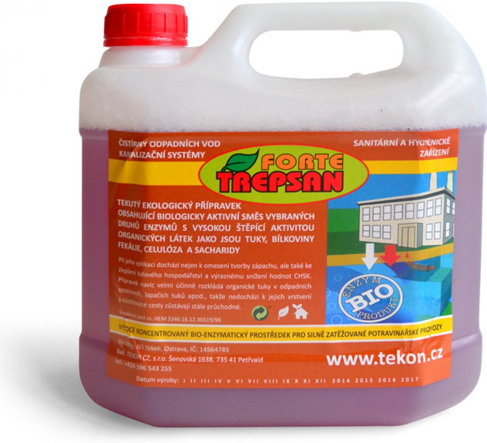 Trepsan forte je silný koncentrát směsi vybraných druhů enzymů se zvýšenou štěpící aktivitou organických látek jako jsou tuky, bílkoviny, fekálie, celulosa, sacharidy apod. Vyrábí se speciálním technologickým postupem. Výsledkem je kapalina obsahující směs proteolytických, amylolytických, celulolytických a lipolytických enzymů, která dokonale vyhovuje uvedeným účelům. Výrobek není toxický, je biologicky odbouratelný a šetří životní prostředí.Přednosti přípravku TREPSAN:výrazně snižuje zápach odpadních vod i celých systémůzlepšuje kalové hospodářství – podporuje separaci kalurozpouští a uvolňuje tukové a další nánosy v odpadních systémech a brání tvorbě úsad, což představuje podstatné omezení havarijních situací i mechanického čištění systémůomezením usazenin v odpadních systémech eliminuje výskyt hlodavcůněkolikanásobně prodlužuje dobu vývozu jímky, žumpy či septikuNávod k použití: Přípravek se dávkuje nejlépe na vstupu do odpadního systému (vpusť apod.). Trepsan Forte se ihned naváže na usazeninové nečistoty. Protékající voda proto výrazněji nesnižuje jeho účinnost. Postupně dochází k uvolnění usazenin už v kanalizaci a zároveň k promíchání obsahu na přítoku.Dávkování v potravinářských provozech,vyvařovnách apod. , případě havarijního stavu - ucpávání odpadního systému doporučujeme dávkovat: 1x denně 0,2 - 0,3 l do každé zatěžované vpusti až do odstranění problému (cca.týden). Pak snížíme dávkování na udržovací dávky, což představuje cca.50% dávkování.Doporučené dávkování pro ČOV: 1:100 až 1:300m3 (Trepsan Forte:množství odpadní vody/24hod - dle problémů)