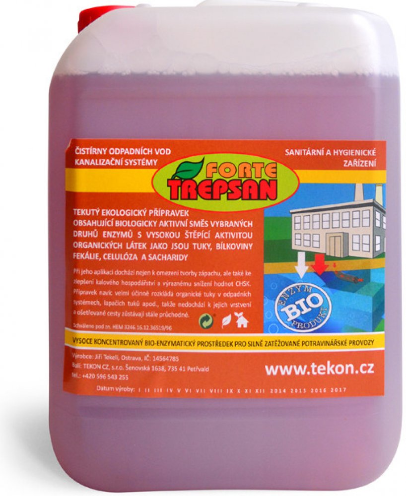 Trepsan forte je silný koncentrát směsi vybraných druhů enzymů se zvýšenou štěpící aktivitou organických látek jako jsou tuky, bílkoviny, fekálie, celulosa, sacharidy apod. Vyrábí se speciálním technologickým postupem. Výsledkem je kapalina obsahující směs proteolytických, amylolytických, celulolytických a lipolytických enzymů, která dokonale vyhovuje uvedeným účelům. Výrobek není toxický, je biologicky odbouratelný a šetří životní prostředí.Přednosti přípravku TREPSAN:výrazně snižuje zápach odpadních vod i celých systémůzlepšuje kalové hospodářství – podporuje separaci kalurozpouští a uvolňuje tukové a další nánosy v odpadních systémech a brání tvorbě úsad, což představuje podstatné omezení havarijních situací i mechanického čištění systémůomezením usazenin v odpadních systémech eliminuje výskyt hlodavcůněkolikanásobně prodlužuje dobu vývozu jímky, žumpy či septikuNávod k použití: Přípravek se dávkuje nejlépe na vstupu do odpadního systému (vpusť apod.). Trepsan Forte se ihned naváže na usazeninové nečistoty. Protékající voda proto výrazněji nesnižuje jeho účinnost. Postupně dochází k uvolnění usazenin už v kanalizaci a zároveň k promíchání obsahu na přítoku.Dávkování v potravinářských provozech,vyvařovnách apod. , případě havarijního stavu - ucpávání odpadního systému doporučujeme dávkovat: 1x denně 0,2 - 0,3 l do každé zatěžované vpusti až do odstranění problému (cca.týden). Pak snížíme dávkování na udržovací dávky, což představuje cca.50% dávkování.Doporučené dávkování pro ČOV: 1:100 až 1:300m3 (Trepsan Forte:množství odpadní vody/24hod - dle problémů)