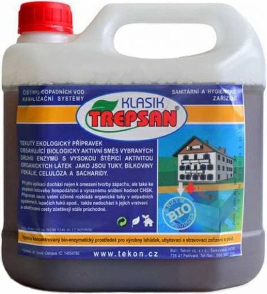 Trepsan Klasik je ideální nalít do kuchyňského nebo koupelnového odpadu, kde už v začátku rozkládá tuky a tím předchází ucpávání potrubí. Je také možné ho aplikovat přímo do vstupní části čistríny. Výrobku nevadí ani protékající voda, protože se okamžitě naváže na nečistoty i staršího data.