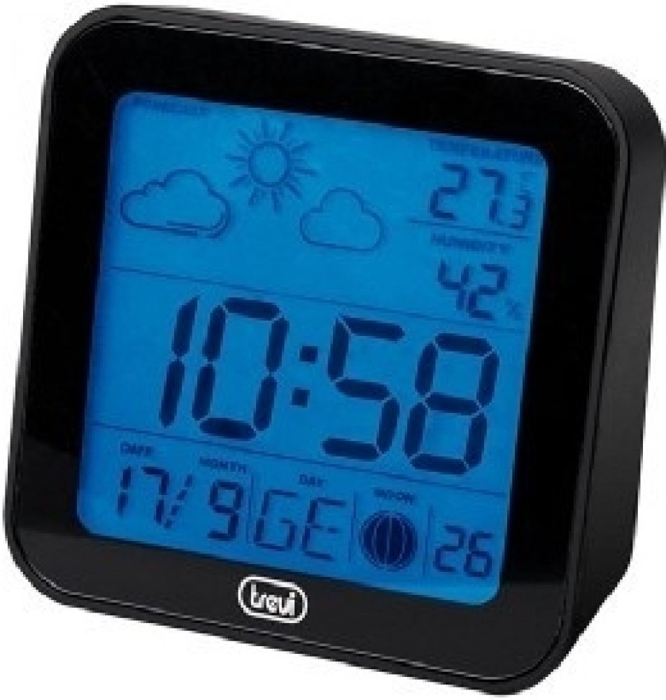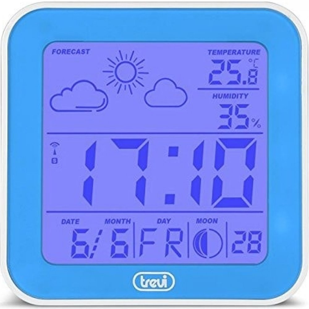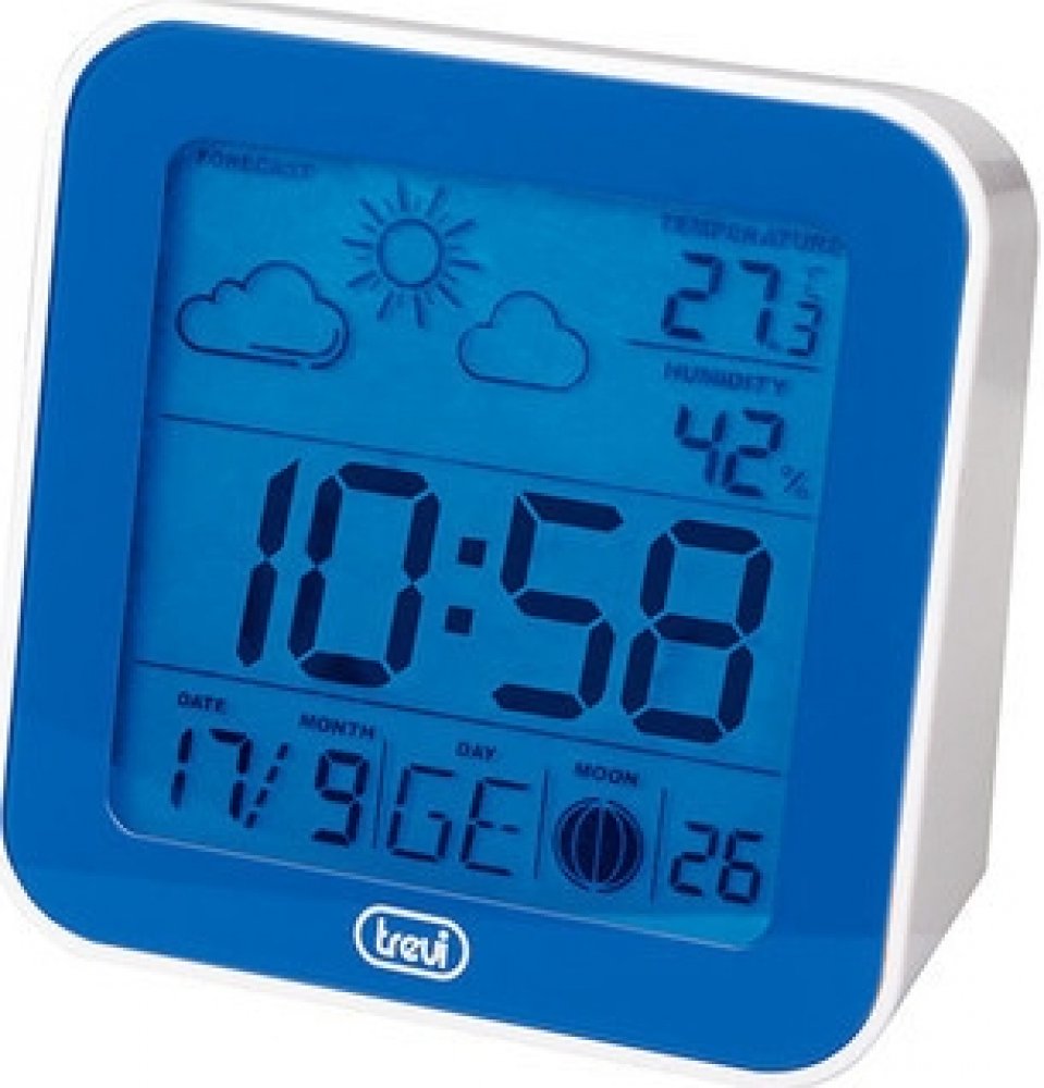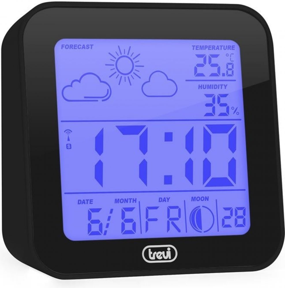 Digitální hodiny řízené rádiovým signálem s meteostanicí • zobrazení 12/24h• alarm, kalendář, den v týdnu, předpověď počasí v ikonovém zobrazení, měsíční fáze, teploměr• modré podsvícení displeje• napájení baterie 2xAAA ( nejsou součásí )• rozměry 95 x 95 x 35mm