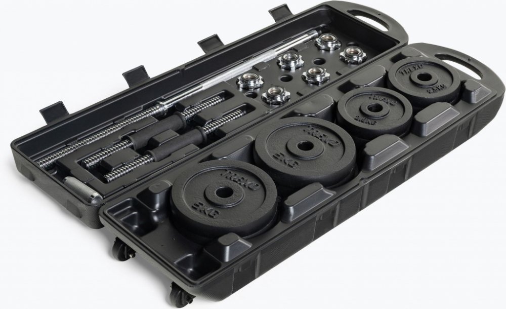 Celý set je umístěn v praktickém kufříku s kolečky, takže jej můžete snadno přenášet a skladovat. Kufr chrání prvky před poškozením a umožňuje udržovat pořádek v domácí posilovně.