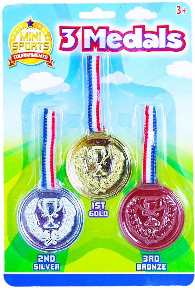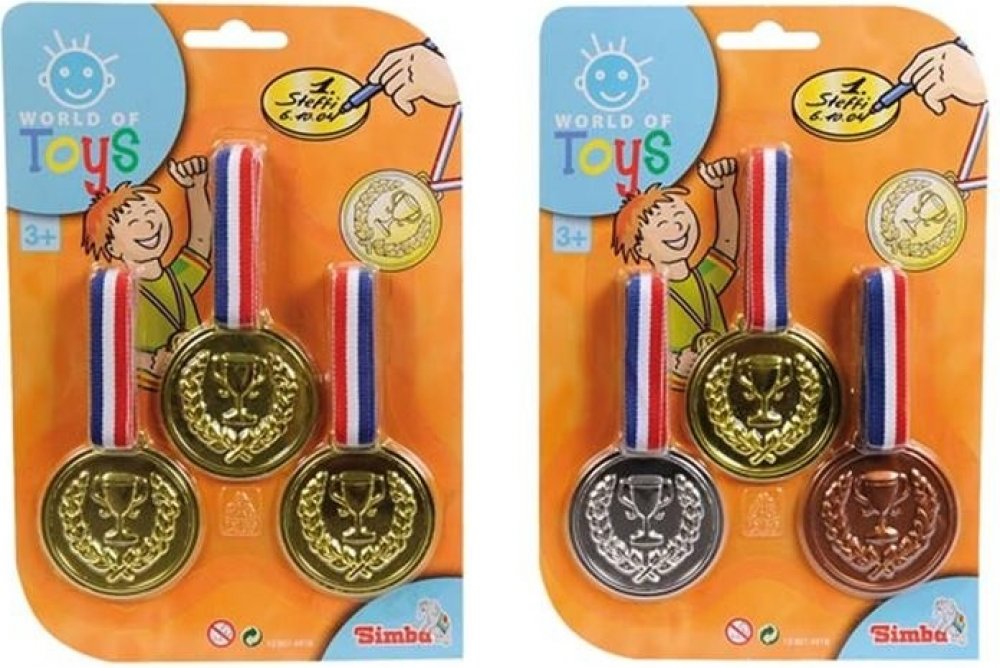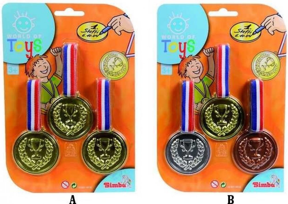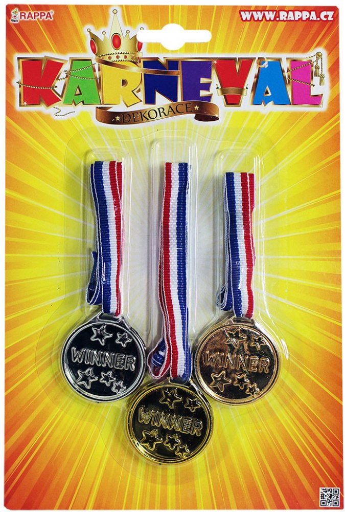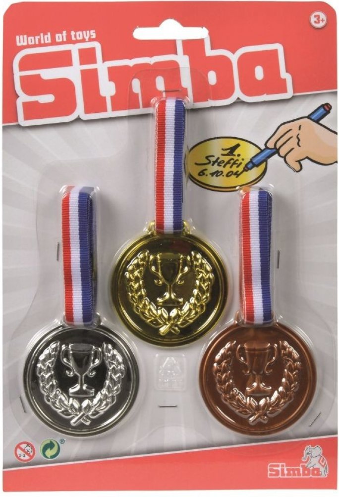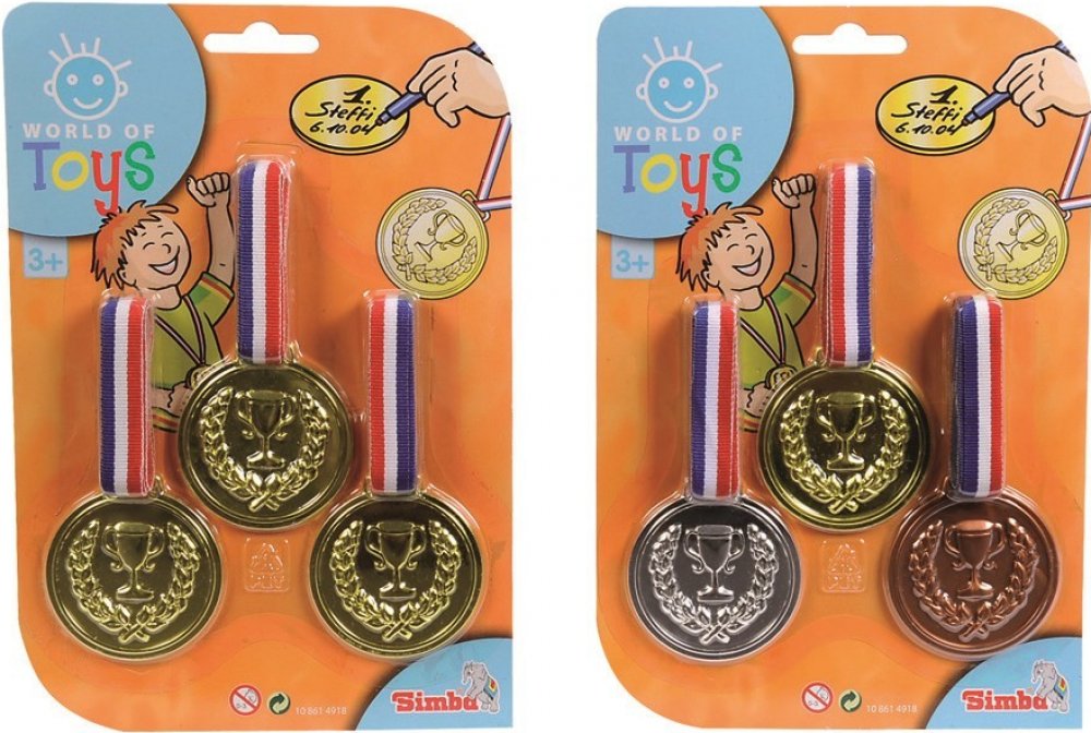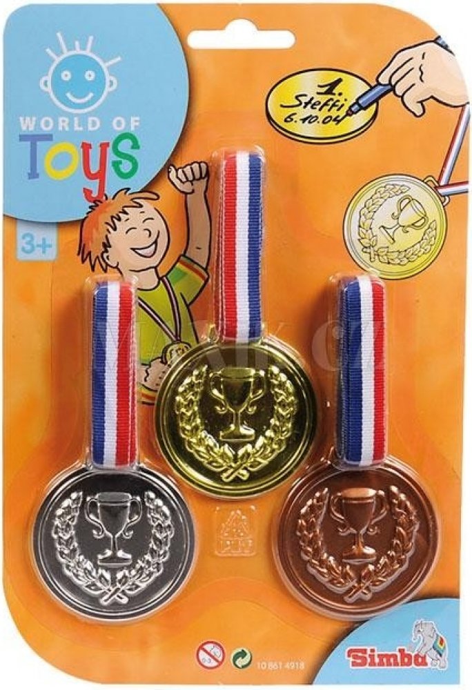 3 zlaté medaile na krk Se zlatými medailemi je vítězství zaručeno. Na zadní stranu medailí můžete napsat. Od 3 let Vystupte na pódium. Tři zlaté medaile z vás udělají vítěze. Zlaté medaile můžete označit na zadní straně. Vhodné pro děti od 3 let. Na pódium. Se třemi zlatými medailemi se stanete vítězem. Zlaté medaile si můžete napsat na záda. Vhodné pro děti od 3 let. 3 zlaté medaile. Průměr medaile 6 cm. 3 zlaté medaile, lze označit na zadní straně, D:6cm, BLK, 3J+