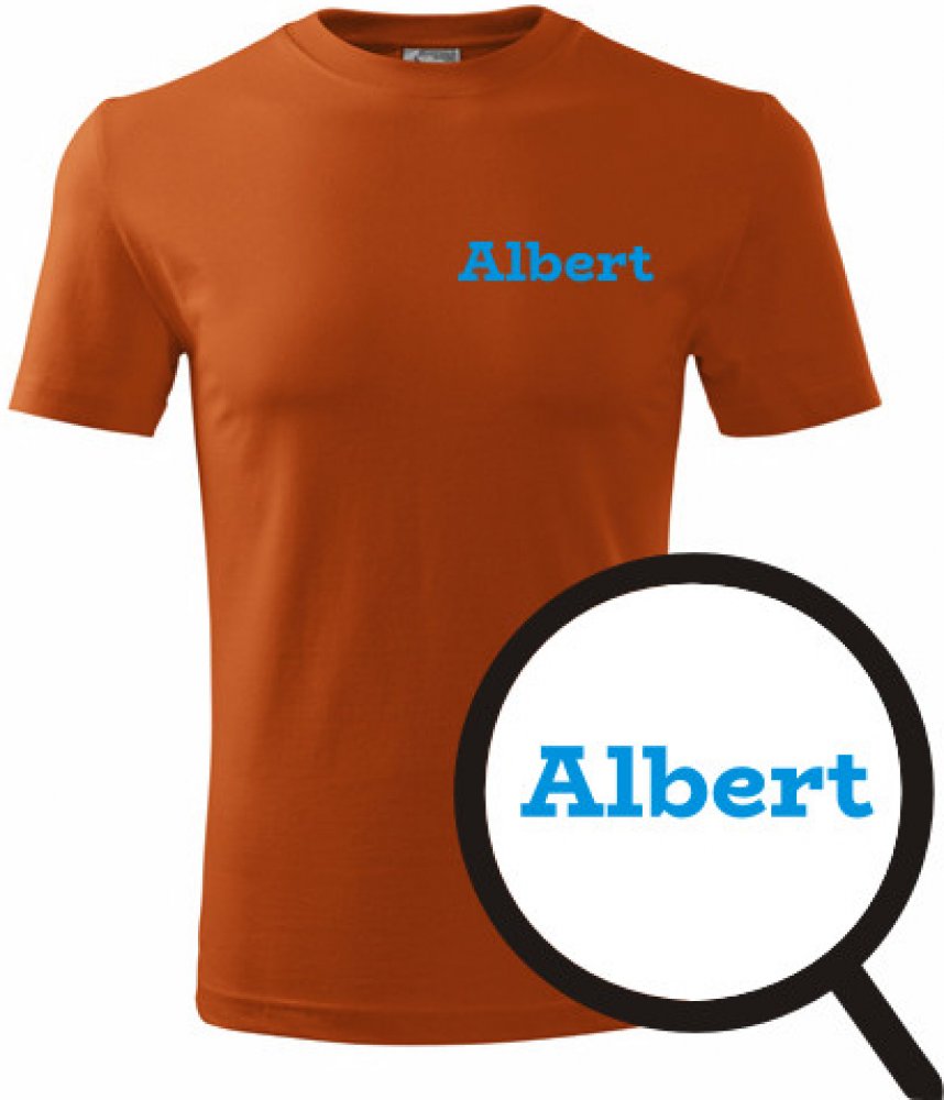 Oranžové tričko Albert. nabízené velikosti jsou S,M,L,XL,XXL,XXXL. Výběr z 12ti barev. Tričko patří do kategorií Trička se jménem na hrudi pánská, . Technologie potisku: Tisk na tričko je realizován pomocí termolisu a potisk je velice trvanlivý.