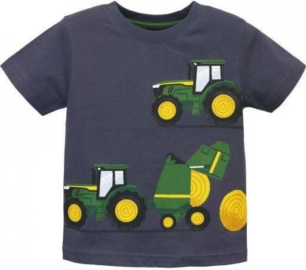 Dětské tmavě modré tričko John Deere s potiskem traktoru a balíky sena vpředu a vzadu