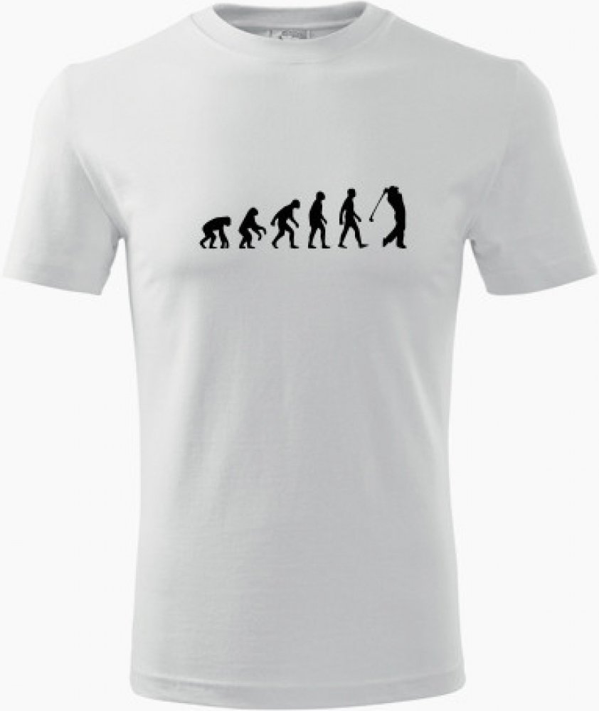 Bílé tričko evoluce golf. nabízené velikosti jsou S,M,L,XL,XXL,XXXL. Výběr z 12ti barev. Tričko patří do kategorií Dárek pro golfistu, Trička evoluce pánská, . Technologie potisku: Tisk na tričko je realizován pomocí termolisu a potisk je velice trvanlivý.