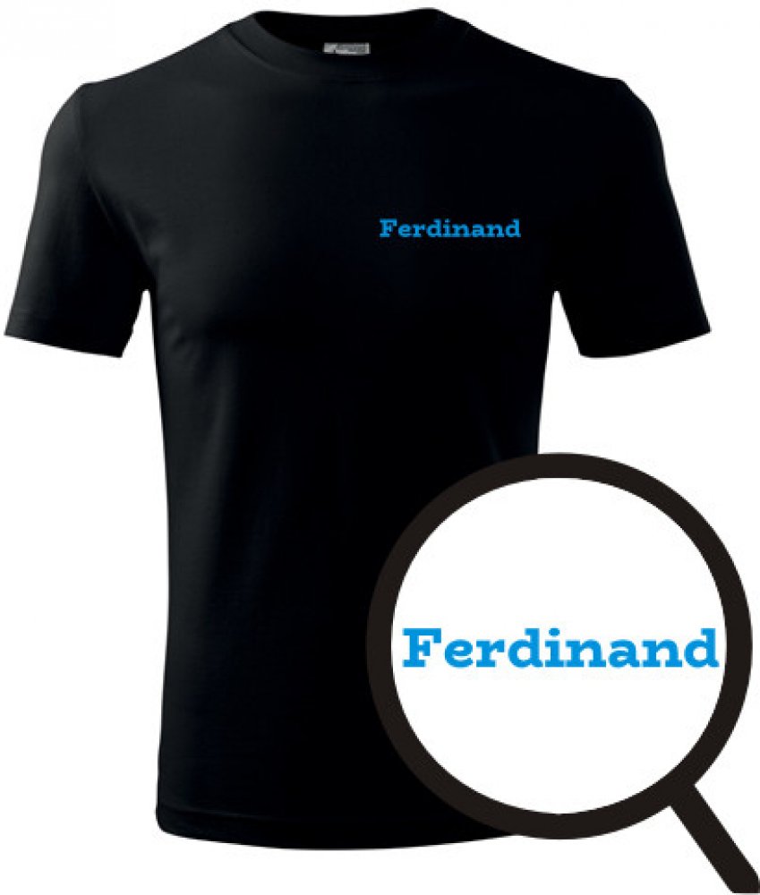 Černé tričko Ferdinand. nabízené velikosti jsou S,M,L,XL,XXL,XXXL. Výběr z 12ti barev. Tričko patří do kategorií Trička se jménem na hrudi pánská, . Technologie potisku: Tisk na tričko je realizován pomocí termolisu a potisk je velice trvanlivý.