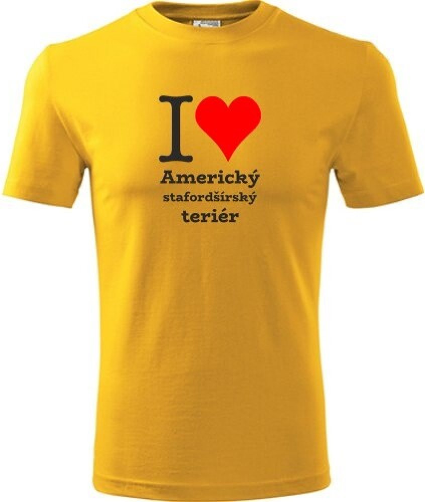 Žluté tričko I love Americký stafordšírský teriér. nabízené velikosti jsou S,M,L,XL,XXL,XXXL. Tričko patří do kategorií Dárek pro pejskaře, . Technologie potisku: Tisk na tričko je realizován pomocí termolisu a potisk je velice trvanlivý.