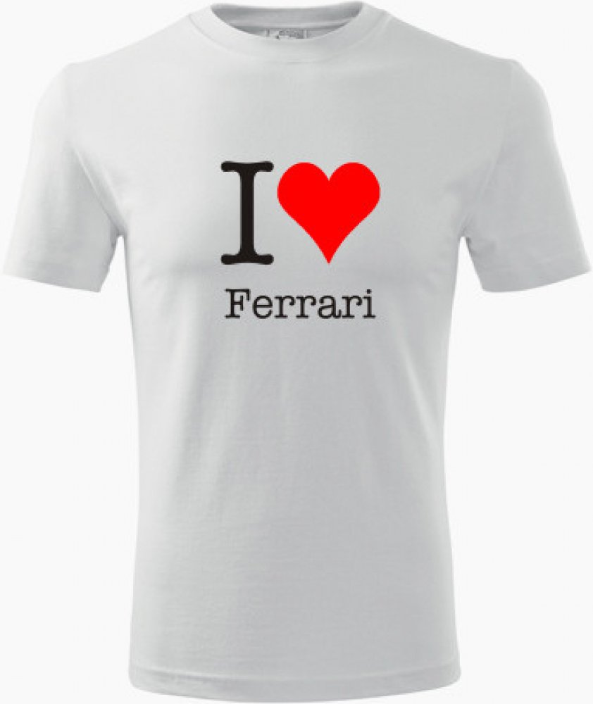 Bílé tričko I love Ferrari. nabízené velikosti jsou S,M,L,XL,XXL,XXXL. Tričko je zařazeno v sekcích Trička I love - auta, Dárek pro příznivce aut, . Technologie tisku: Tisk na tričko je realizován pomocí termolisu a potisk je velice trvanlivý.