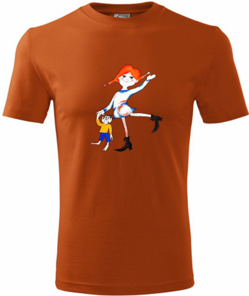 Oranžové tričko Pipi Dlouhá Punčocha. nabízené velikosti jsou S,M,L,XL,XXL,XXXL. Výběr z 12ti barev. Tričko patří do kategorií . Technologie potisku: Tisk na tričko je realizován pomocí termolisu a potisk je velice trvanlivý.
