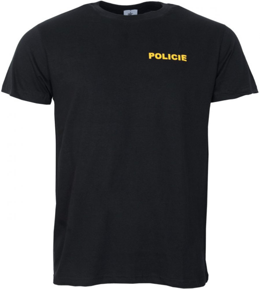 Kvalitní černé bavlněné tričko s velkým (327 x 50 mm) žlutým nápisem POLICIE na zádech a týmž nápisem malými písmeny (116 x 18 mm) vlevo na hrudi