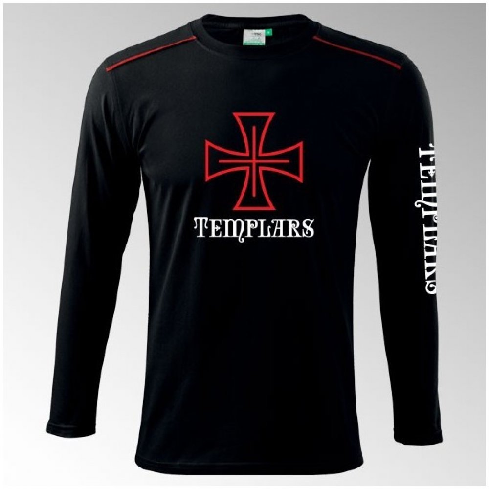 Templářské triko s dlouhým rukávem a s potiskem. Potisk Templářský kříž a nápis na hrudi a velký nápis TEMPLARS na levém rukávu. Moderní tričko s dlouhým rukávem, členící švy na ramenou s kontrastním proužkem, zpevňující páska. 100 % bavlna, 180 g/m²