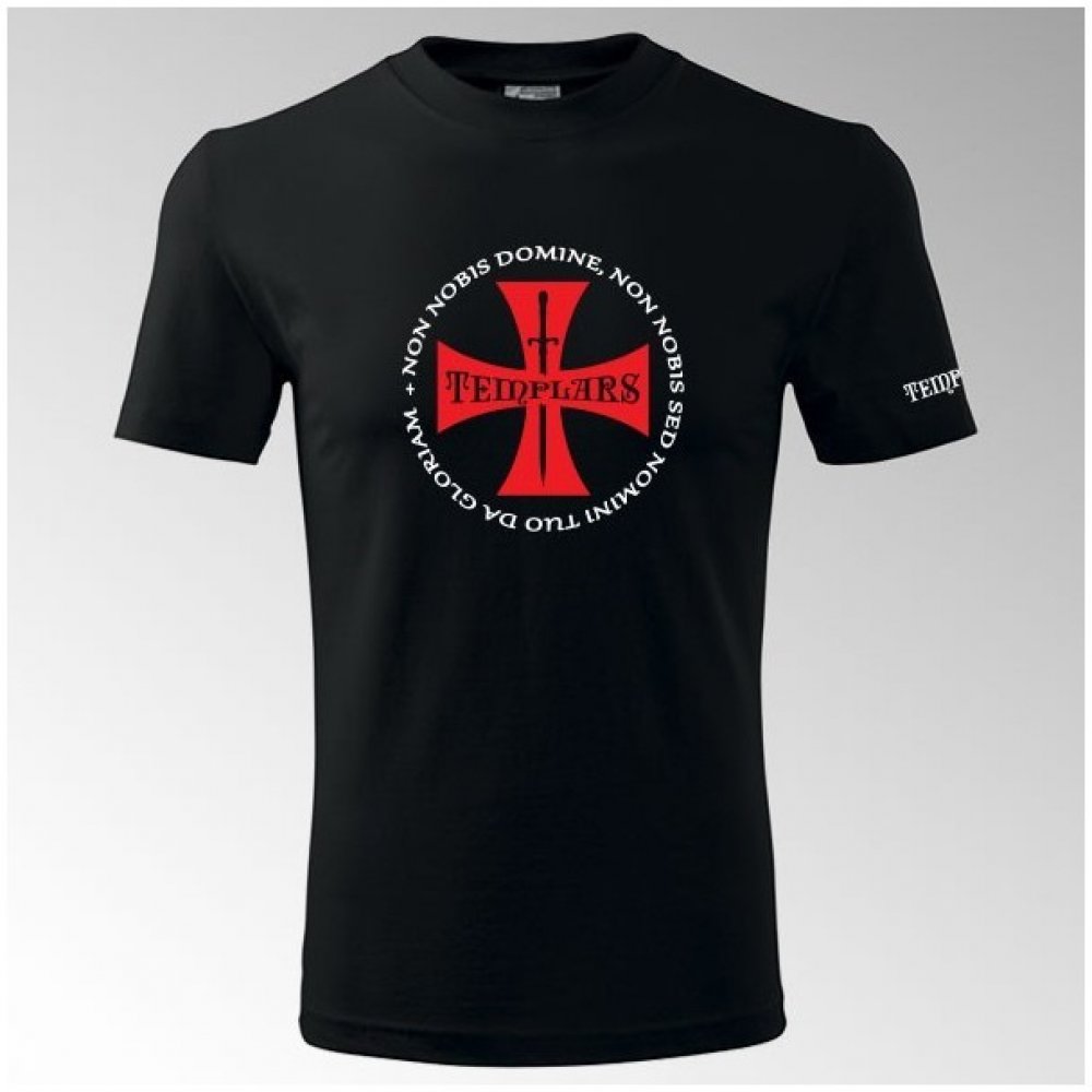 Templářské triko s potiskem. Potisk Templářský kříž a nápis do kruhu na hrudi, potisk na levém rameni. Velmi pohodlné bavlněné tričko s krátkým rukávem střední gramáže.