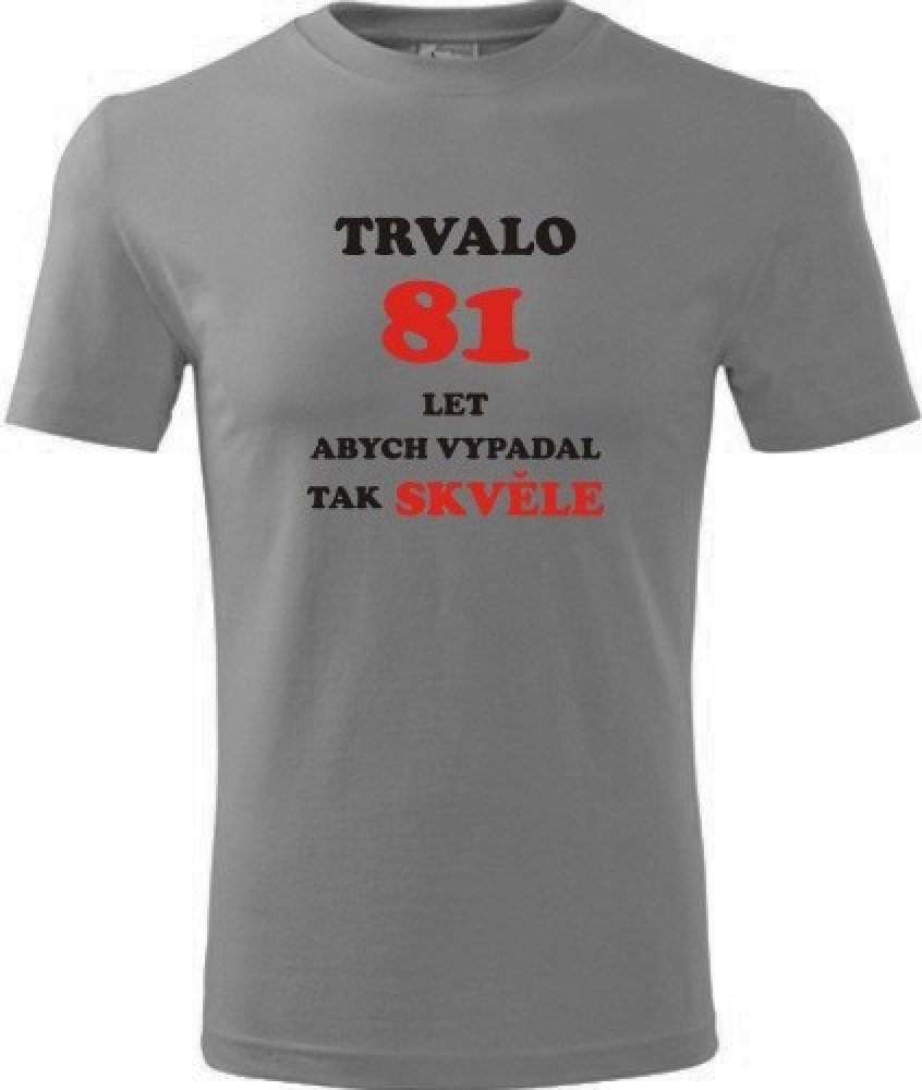 Šedé tričko trvalo 81 let. nabízené velikosti jsou S,M,L,XL,XXL,XXXL. Výběr z 12ti barev. Tričko patří do kategorií Dárek pro muže k 81, . Technologie potisku: Tisk na tričko je realizován pomocí termolisu a potisk je velice trvanlivý.