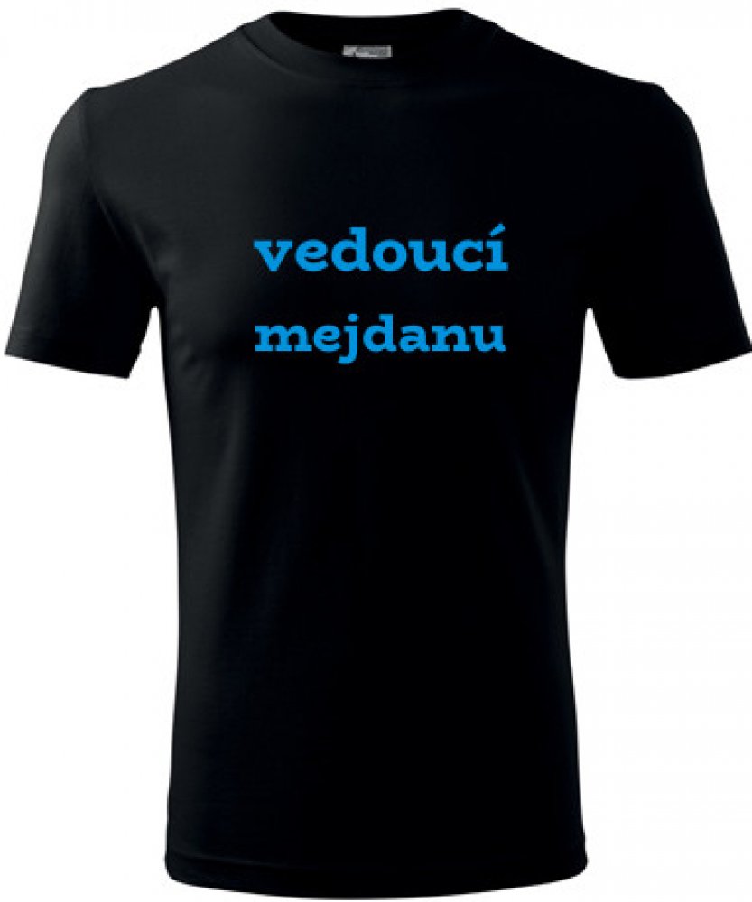 Černé tričko vedoucí mejdanu. nabízené velikosti jsou S,M,L,XL,XXL,XXXL. Výběr z 12ti barev. Tričko patří do kategorií Vtipná pánská trička, . Technologie potisku: Tisk na tričko je realizován pomocí termolisu a potisk je velice trvanlivý.