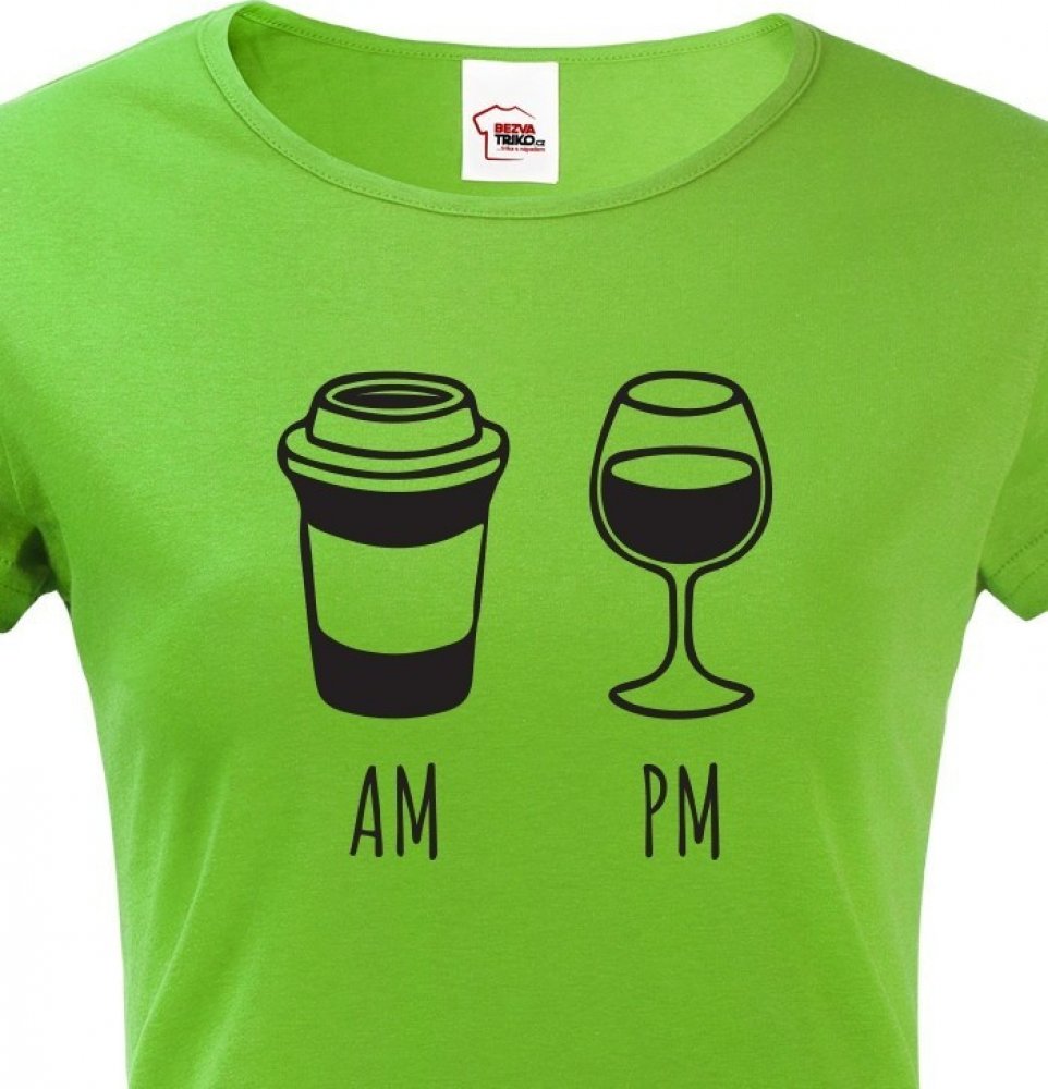 Další vtipné triko s vínem pro naše dámy. Pokud milujete večer sklenku vína a přes den Vás dobíjí šálek dobré kávy, tohle tričko si zamilujete. Minimalistický a přesto originální potisk sklenice vína a kelímku kávy zaujme okolí.