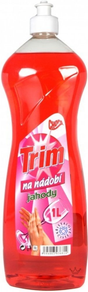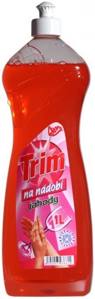 Účinný prostředek na mytí nádobí Trim jahody s velmi dobrou odmašťovací schopností a aromatickou vůní jahod účinně odstraňuje nečistoty a zanechává nádobí čisté a lesknoucí se. Díky svému šetrnému složení je také velmi jemný k vašim rukám. Zanechává sklo kříšťálově čisté.
