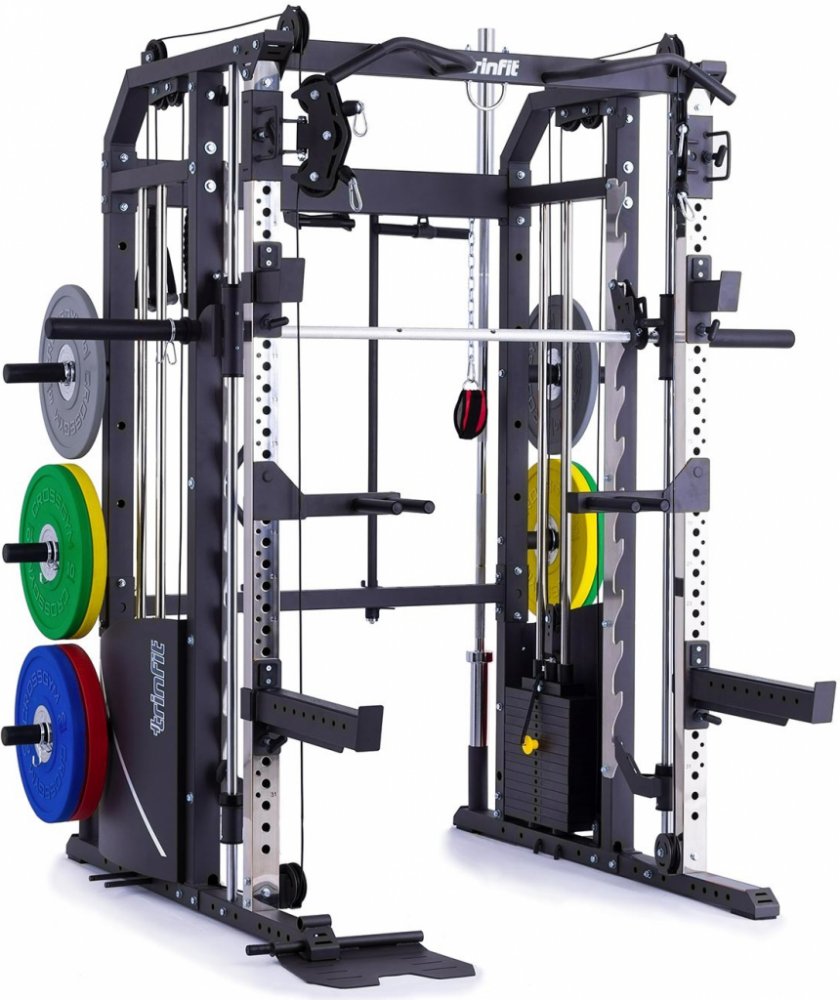 multifunkční multipress se stojanem na činku, výškově nastavitelné kladky, hrazda