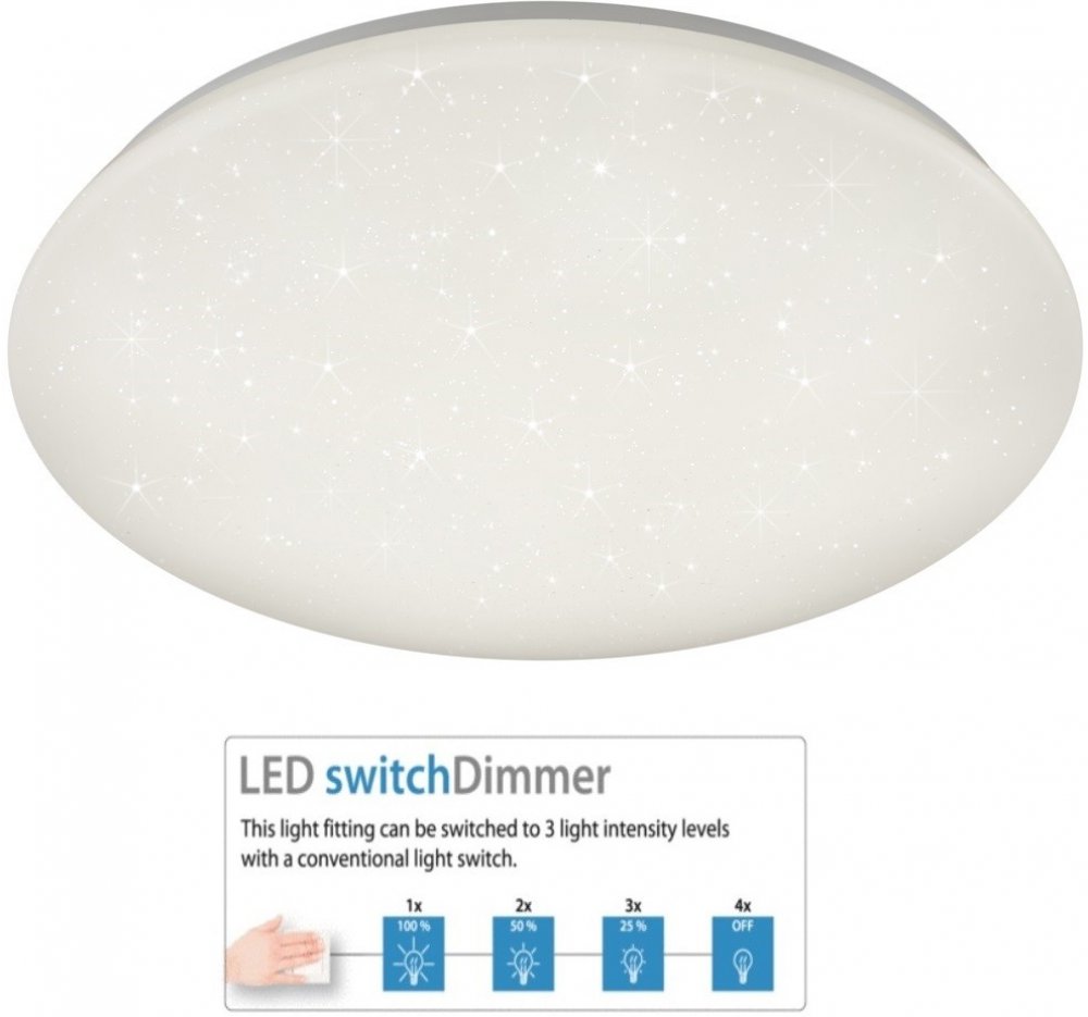 Představte si, že sedíte za vlahého letního večera v zahradě, na balkóně nebo na louce uprostřed zeleně a díváte se na hvězdy. Jaký uklidňující, relaxační pocit se pak ve Vás rozprostírá. Ten klid, ten kouzelný pohled. Díky stropnímu svítidlu Potz značky Reality máte nyní možnost přenést si hvězdné nebe snadno do svého domova. Rozkošný design krytu stropního svítidla vytvoří zcela samostatně báječný efekt hvězdné oblohy. Toto nápadité LED stropní svítidlo se vzhledem hvězdné oblohy je z plastu s dlouhou životností a má mnohostranné využití díky stupni krytí proti stříkající vodě (IP44). Přes 4cestný spínací stmívač lze svítidlo pohodlně ztmavit na požadovaný jas.