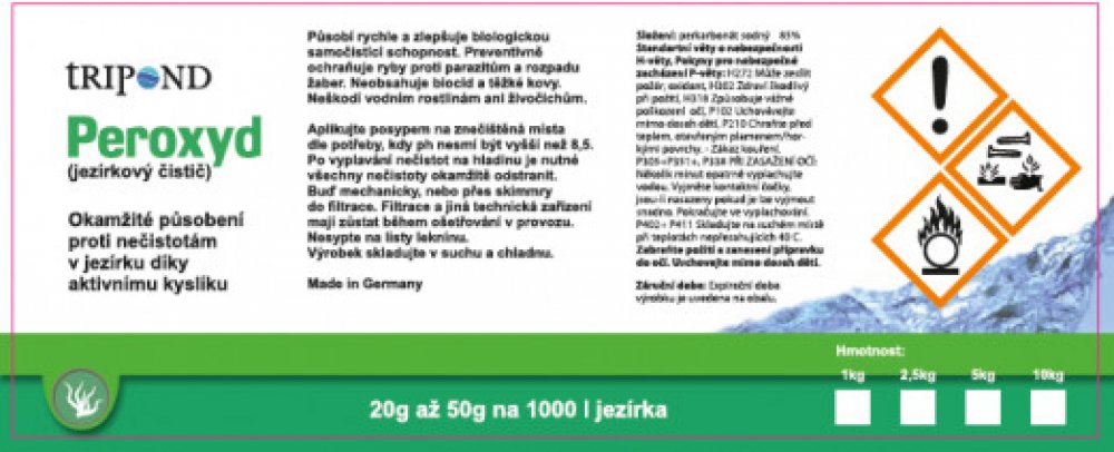 Okamžité působení proti vláknité řase prostřednictvím aktivního kyslíku. Působí rychle a zlepšuje biologickou samočistící schopnost. Preventivně ochraňuje ryby proti parazitům a rozpadu žaber. Neobsahuje biocidy a těžké kovy. Něškodí vodním rostlinám ani živočichům. Peroxyd působí okamžitým uvolňováním aktivních kyselin ve vodě. Začínající oxidace ničí buněčnou strukturu vláknitých řas.
