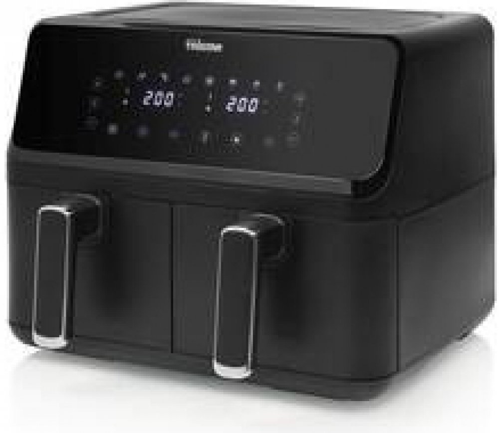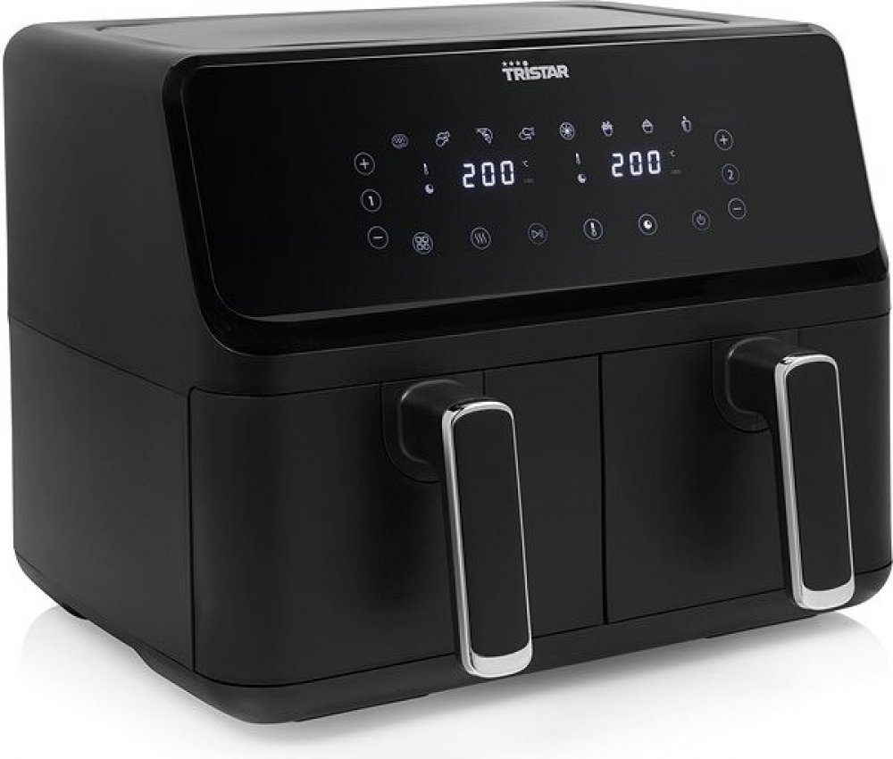 horkovzdušná fritéza příkon 2 700 W objem fritovacích košů 2× 4 l digitální displej 8 automatických programů nepřilnavý povrch časovač regulace teploty: 80 až 200 °C