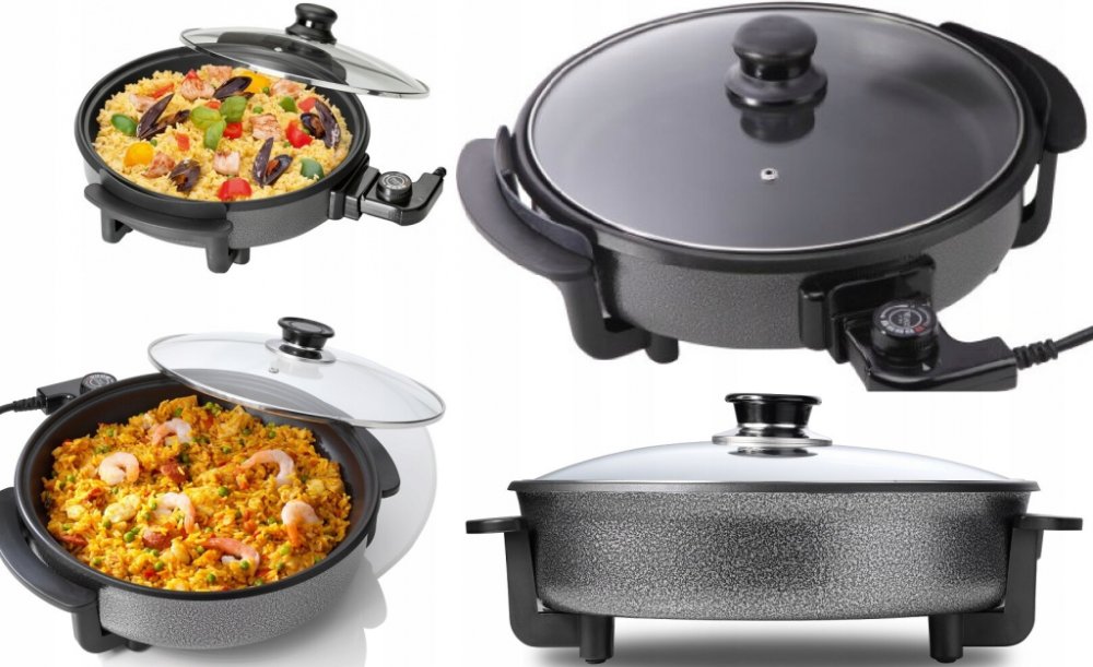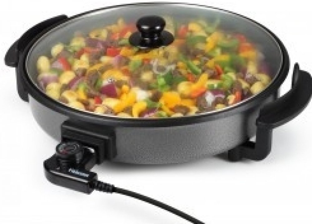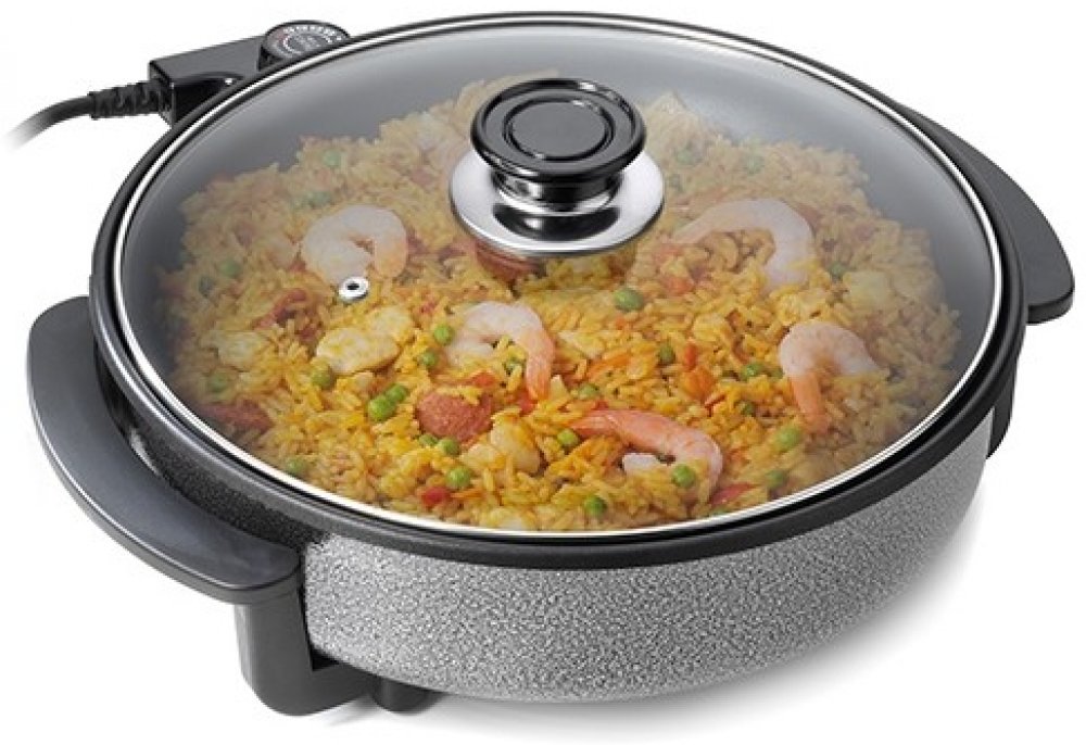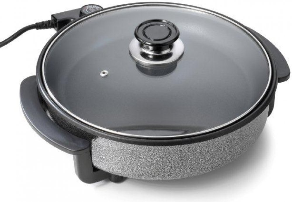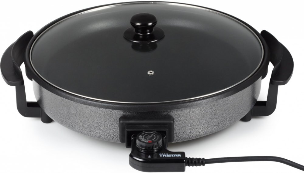 Multifunkční pánev Tristar PZ 2964 o průměru 40 centimetrů, se skleněným víkem a nastavitelným termostatem do maximální teploty 280° C.