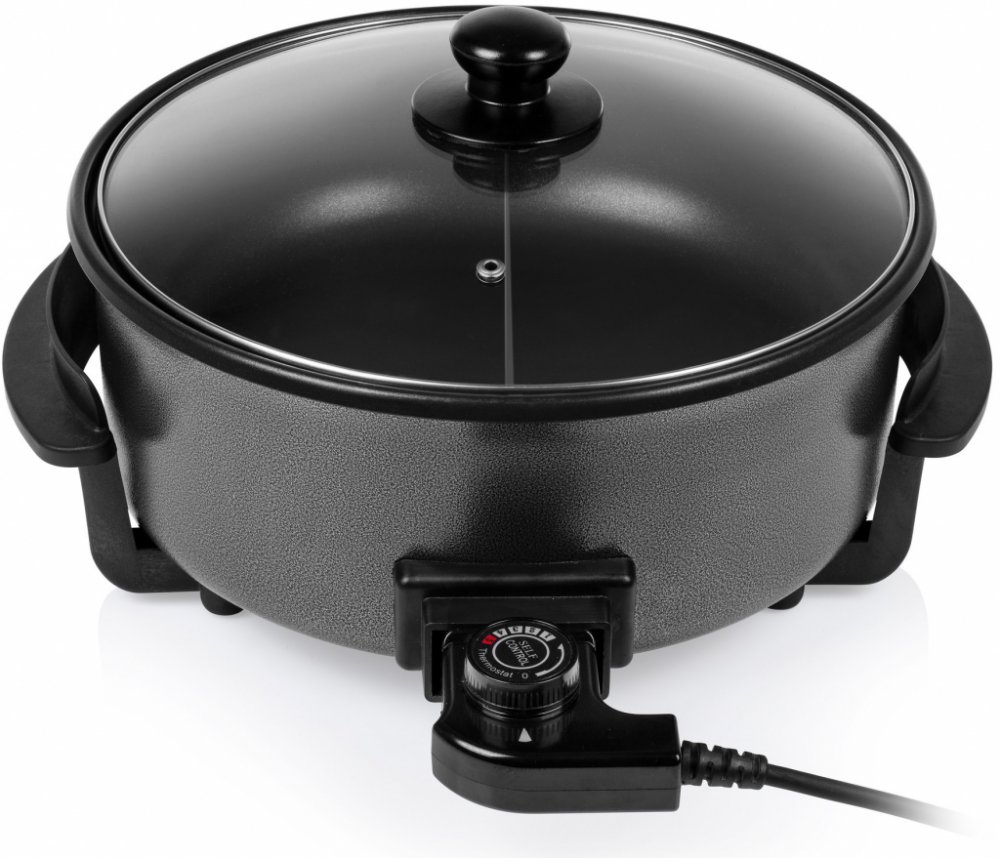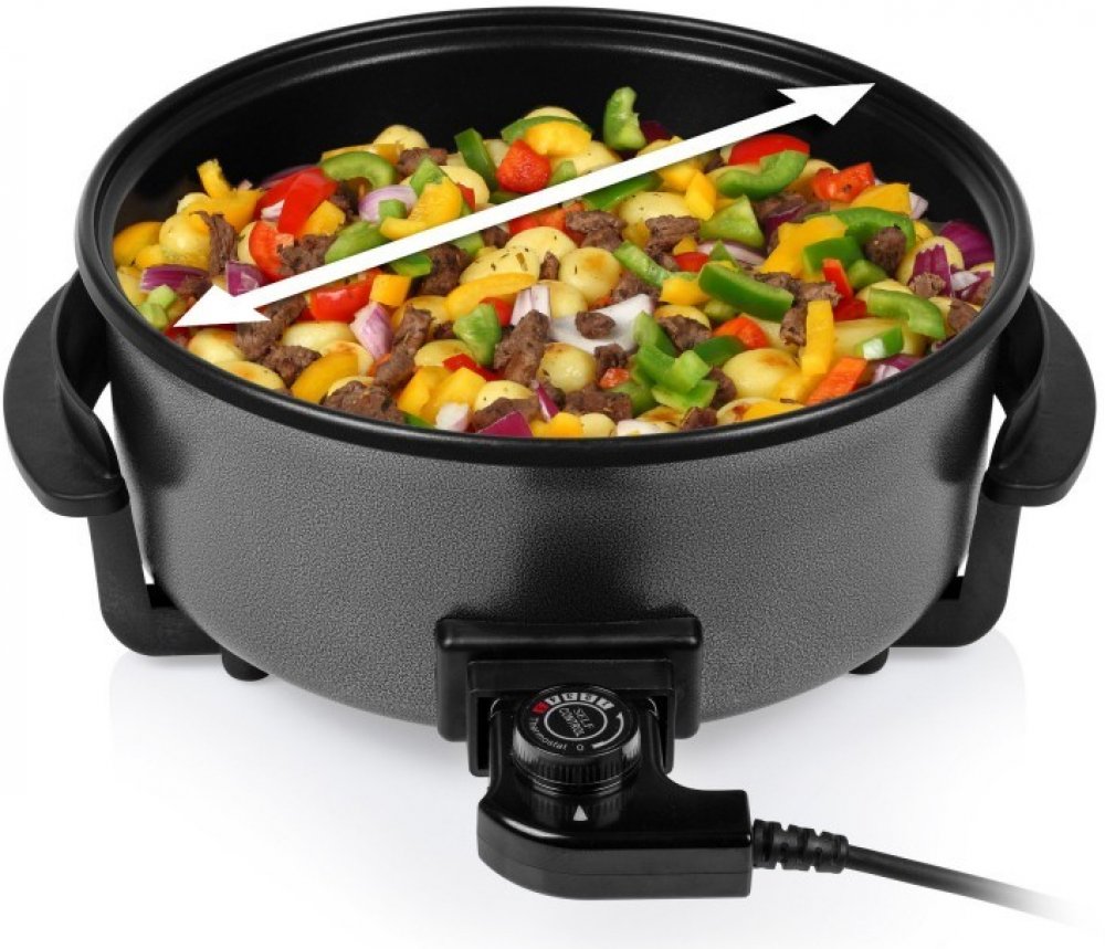 Elektrická pánev 1500W, objem 5l, výška 9cm, průměr pečící pánve 30cm, s příslušenstvím pro rozdělení prochy na 2 části, odnímatelný termostat s plynulou regulací teploty, světelná indikace provozu, nádoba s nepřilnavým povrchem, skleněné víko s výfukem páry, možnost pečení/smažení/dušení/zapékání/vaření, délka kabelu 0.9m