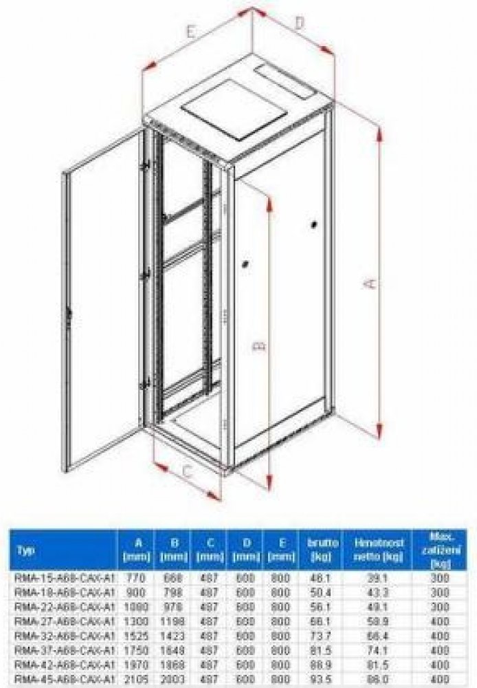 27 U a rozměry 600 x 800 mm je určen pro instalaci datových a