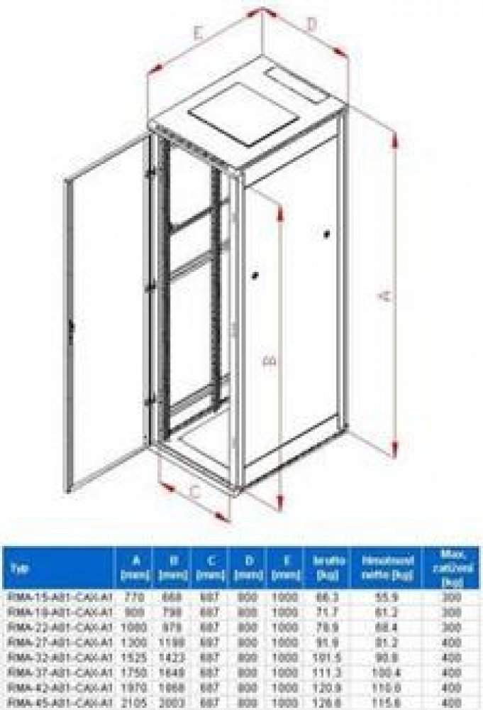 19", výškou 42 U a rozměry 800 x 1000 mm je určen pro instalaci