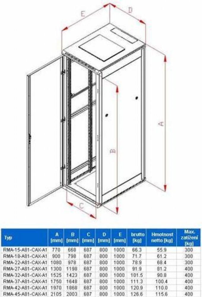 • stojanové rozvaděče RMA standardní konfigurace (skleněné dveře, šedá barva) v rozměrech 600x600, do výšky 42U