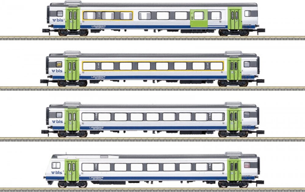 Předloha: Čtyři rychlíkové vozy typu Einheitswagen III (EW III) BLS Lötschbergbahn AG (Bern-Lötschberg-Simplon). Skládá se z vozu 1. třídy se zavazadlovým prostorem AD, vozu 1. třídy A, vozu 2. třídy BOLD a 2. třídy řídicího vozu Bt. Model: Řídící vůz s 3-světelným světlometem na straně kabiny řidiče se změnou světla 3x bílé a 1x bílé a se 14-pinovým digitálním rozhraním. Připraveno pro následnou instalaci vnitřního osvětlení - vhodné vnitřní osvětlení LED: Trix 66611 pro osobní vozy, Trix 66616 pro řídící vůz. Při použití dekodéru Minitrix lze separátně ovládat světlomety a vnitřní osvětlení. Reálnou vlakovou soupravu lze vytvořit doplněním o lokomotivu řady Re 4/4 II, obj.číslo 16884, a vozy rychlíku obj.číslo 18293 a 18294. Kinematika krátkého spřáhla s šachtou de NEM. Není určeno pro děti do 15 let.
