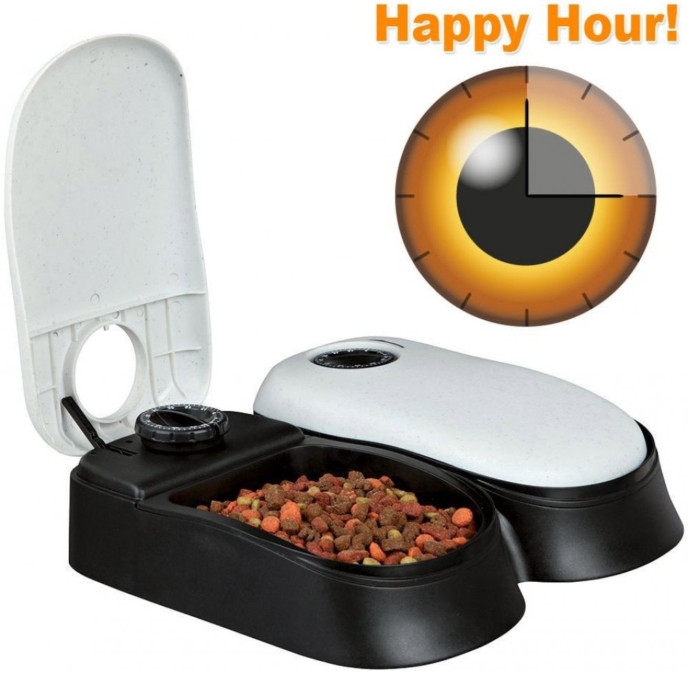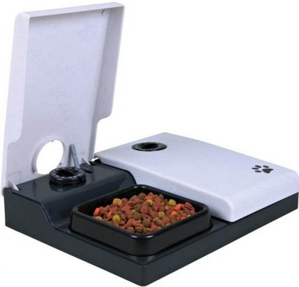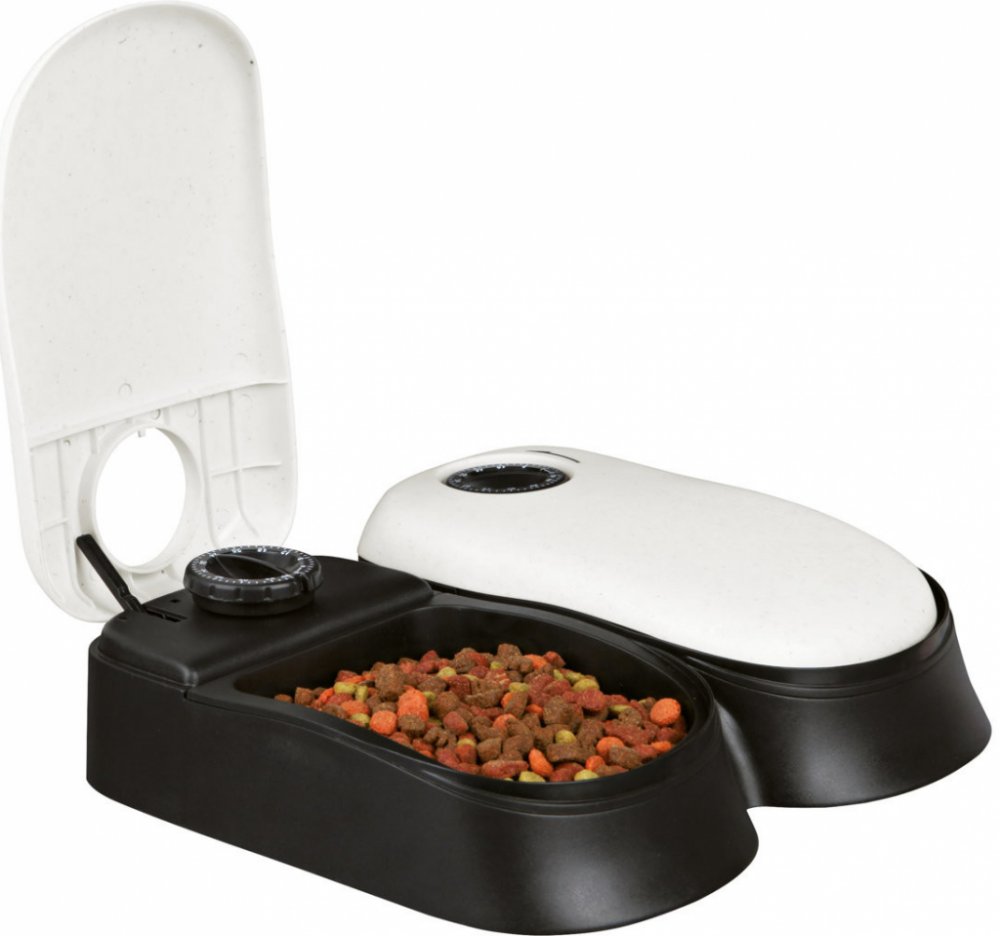 Krmítko je složeno ze dvou misek, každá o objemu 300 ml a z krytu, který se otevře v předem určený čas. Ten se určí tím, že na dávkovači nastavíte počet hodin, za který se má krmítko otevřít. Každá nádobka má možnost nastavení svého času. Tento čas je možné nastavit v rozmezí 1 až 48 hodin. Při plnění krmítka tedy jen nastavíte čas a nádobku zavřete, ostatní už udělá krmítko za Vás.
