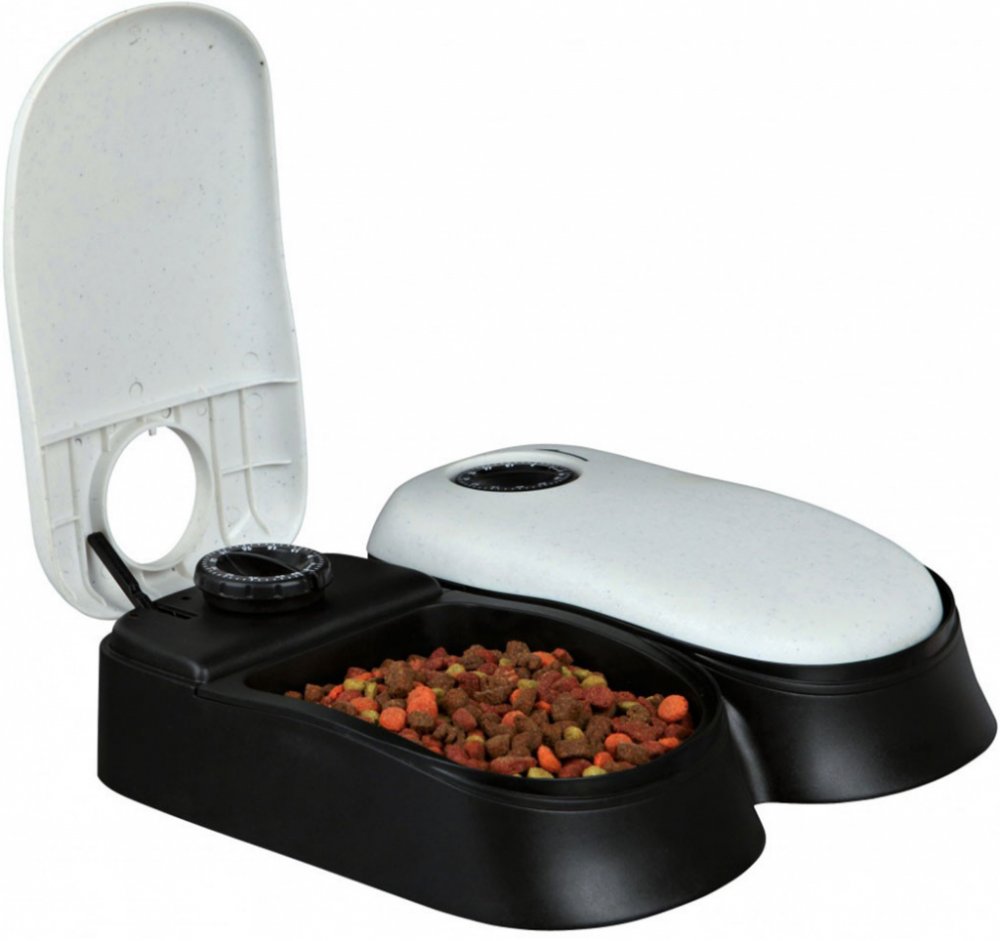 Krmítko je složeno ze dvou misek, každá o objemu 300 ml a z krytu, který se otevře v předem určený čas. Ten se určí tím, že na dávkovači nastavíte počet hodin, za který se má krmítko otevřít. Každá nádobka má možnost nastavení svého času. Tento čas je možné nastavit v rozmezí 1 až 48 hodin...