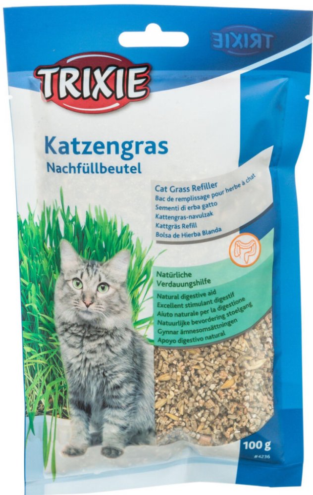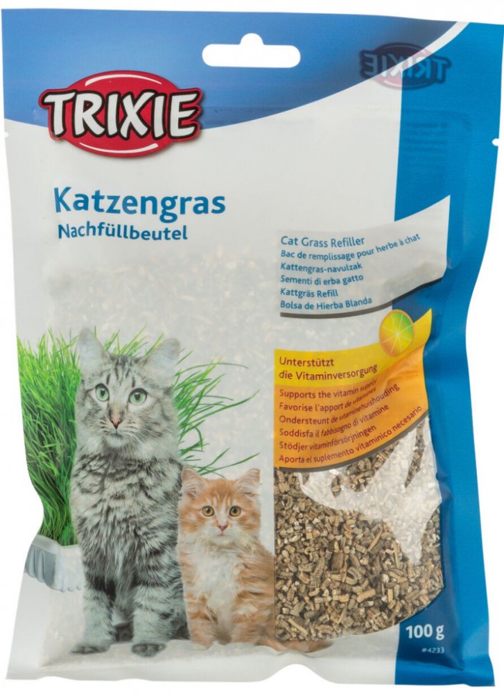 Extra jemná a měkká tráva Trixie chutná koťatům i kočkám. Kočky trávu vyžadují jako doplněk výživy. Čerstvá zeleň od Trixie obsahuje mnoho vitamínů, minerálů a také chlorofyl. Díky trávě kočka mnohem snáze vylučuje spolknuté chuchvalce chlupů a srsti. Doba růstu trávy silně závisí na světelných a teplotních podmínkách, ale obecně je Trixie tráva vyklíčena velmi rychle. Pamlsek pro kočky v podobě čerstvé trávy kočky milují a navíc jim podporuje trávení a zamezuje tvorbě bezoárů. Kočičí tráva pochází z výběrových políček.