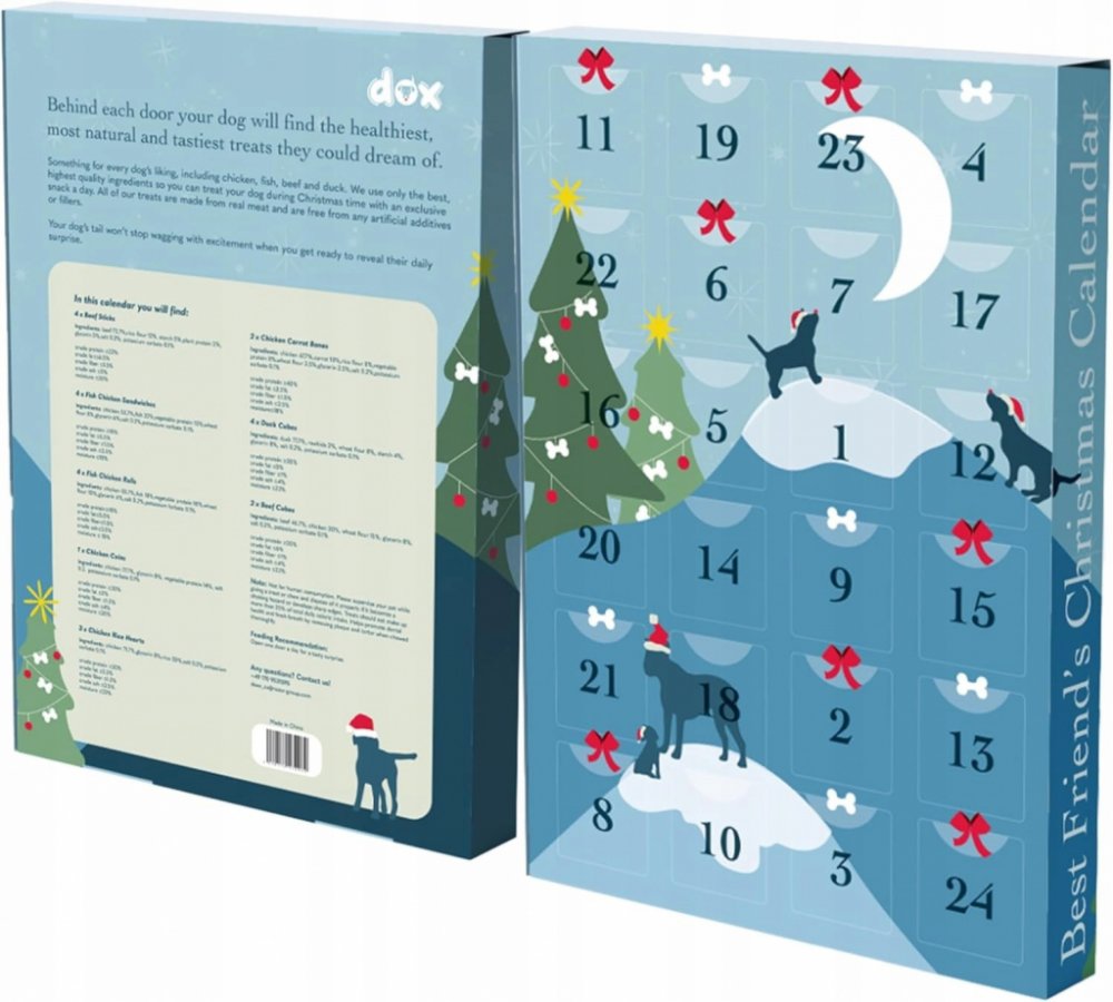 Adventní kalendář pro psa obsahuje: