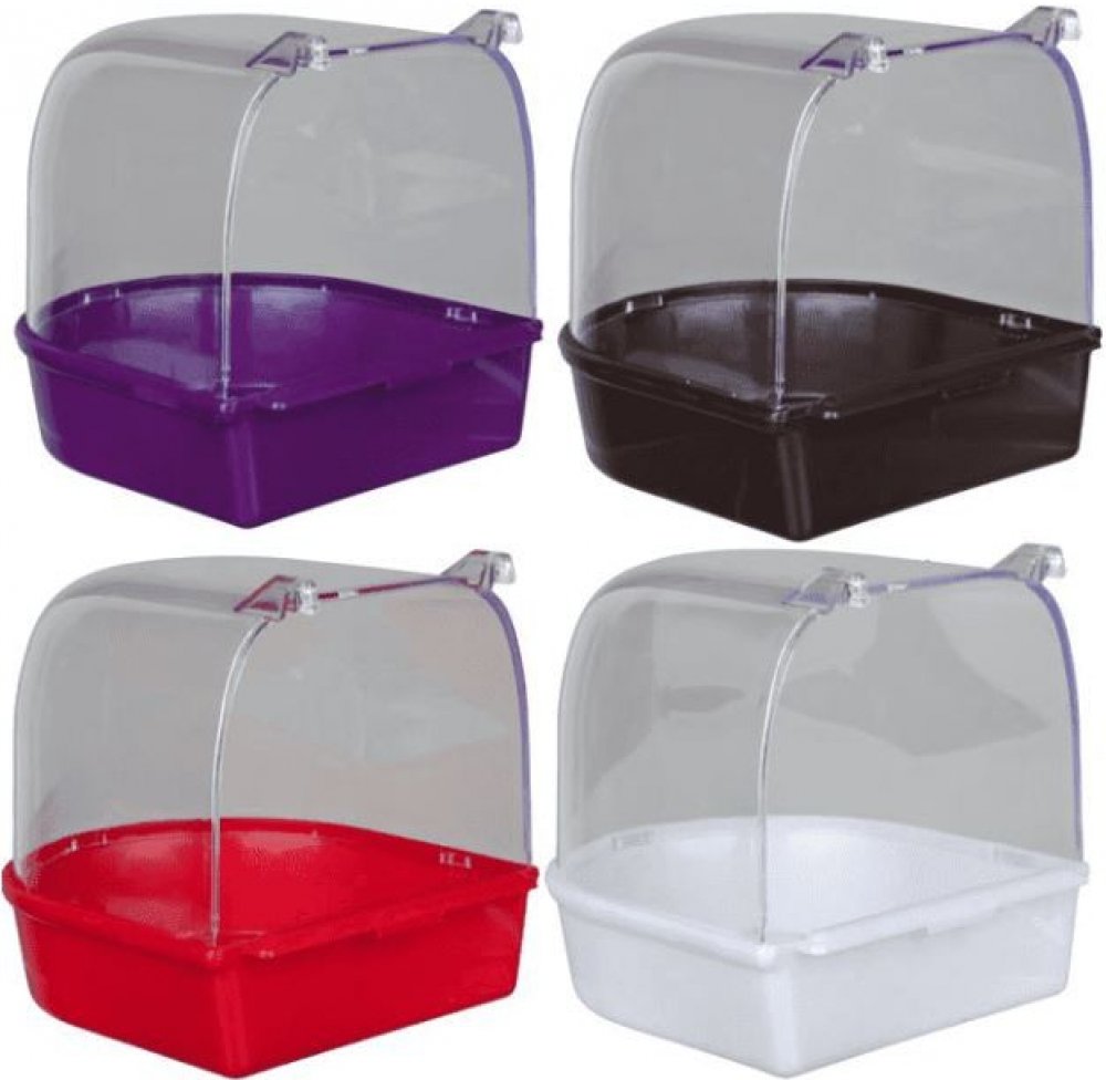 Plastová koupelna pro andulky a kanáry. Je vhodná pro hygienu ptáků. Zároveň slouží jako prima zábava pro malé opeřence. Pomocí úchytů se snadno upevňuje na dvířka klecí. Vyrobena z umělé hmoty. Vrchní díl je celoprůsvitný, zaoblený. Vhodná do všech klecí kromě kulatých. Z odolného a netoxického materiálu Snadná údržba Různé barvy Pro kanáry a andulky Rozměr 14*14*15cm