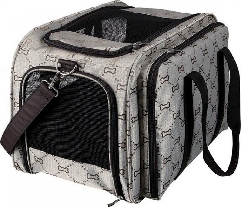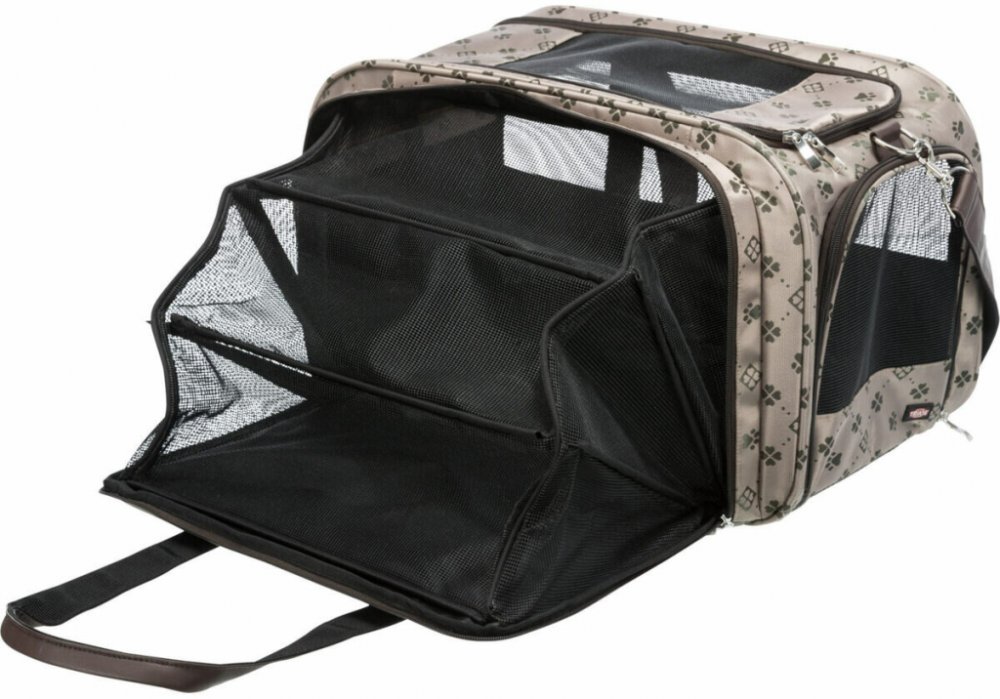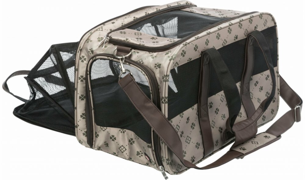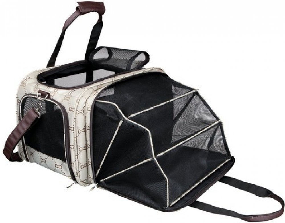 Luxusní, prostorná, cestovní taška Maxima pro psy. Největší výhodou této tašky je, že můžete Vašemu mazlíčkovi, pomocí boční síťované vložky, rozšířit prostor pro ležení. Díky tomu lze tašku využít jako cestovní boudičku. Jistě oceníte také dlouhý popruh pro nošení tašky přes rameno a boční kapsičku na nezbytné drobnosti. Dno tašky je polstrované. Uvnitř najdete krátký popruh, který zabraňuje vyskočení zvířete z otevřené tašky a následnému zranění. Síťované vsadky zajistí dobrou cirkulaci vzduchu.