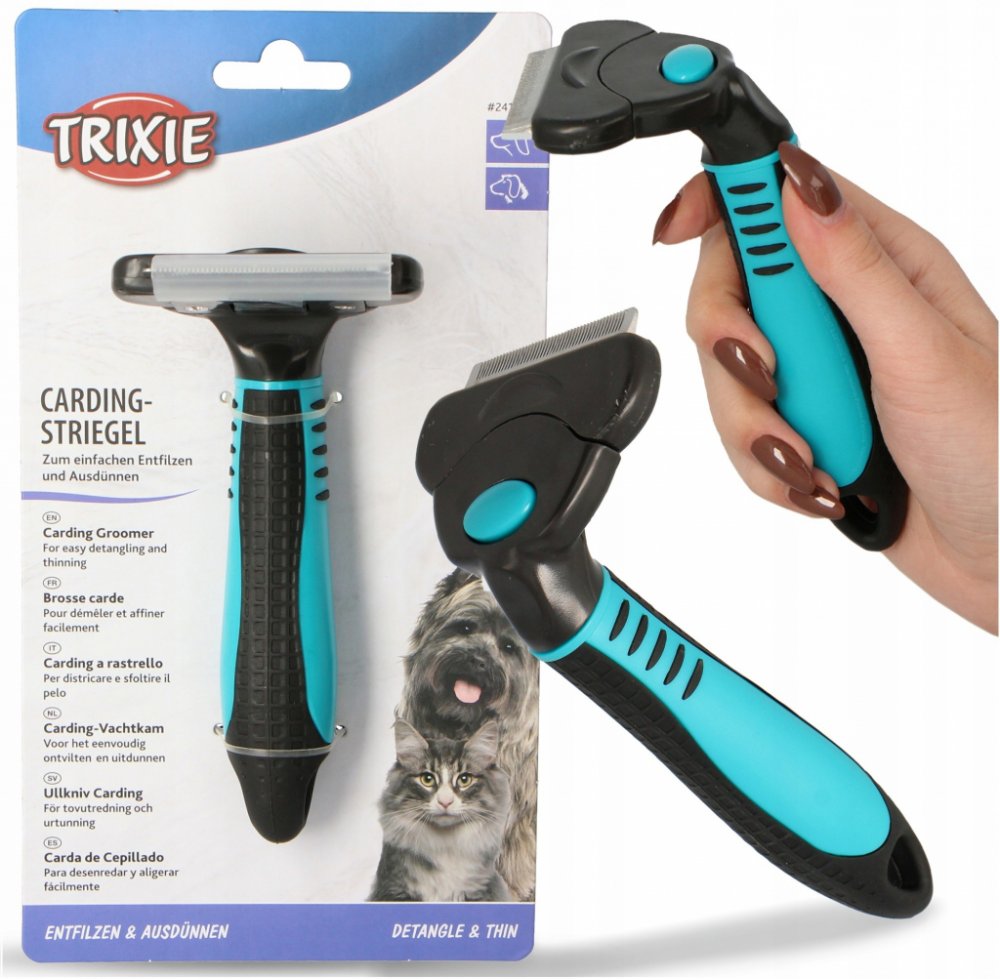 Hřeben pro psy s vyměnitelnou hlavou. Hlava se snadno vyměňuje pomocí snap mechanismu na rukojeti. Vhodný pro dlouhosrsté, krátkosrsté a hrubosrsté psy. Hřeben má plastovou rukojeť s protiskluzovou gumou. Efektivně odstraňuje odumřelou srst.