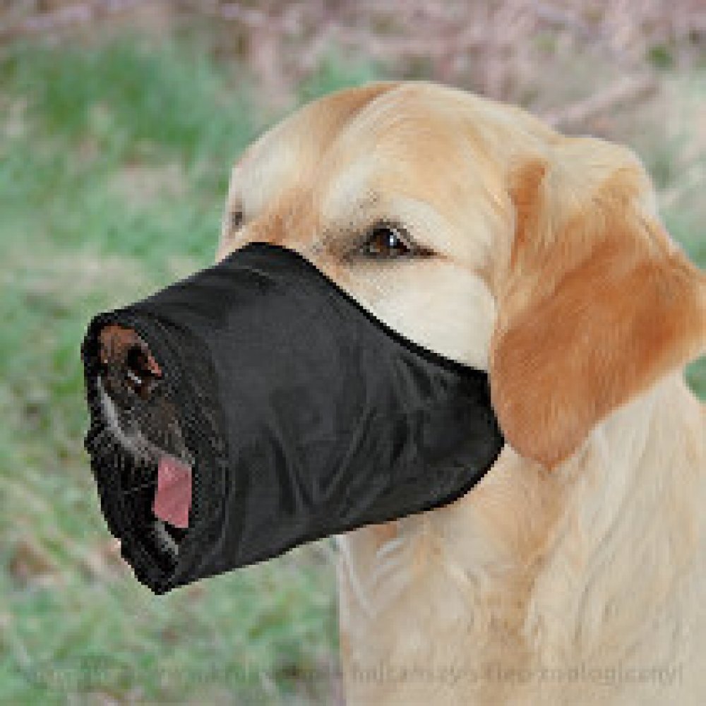 Ochranný nylonový náhubek s měkkým flaušem uvnitř, v černé barvě, použitelný k fixaci tlamy psa např. při veterinárním ošetření i jako běžný nahubek.