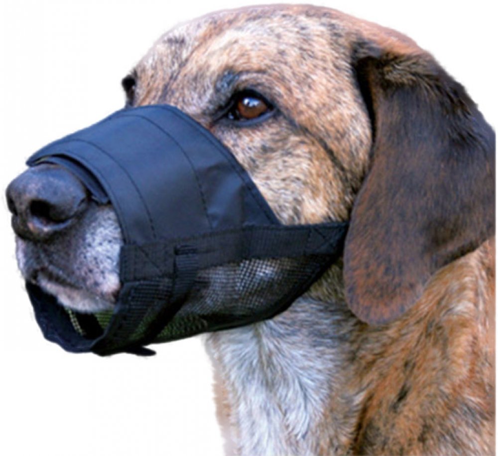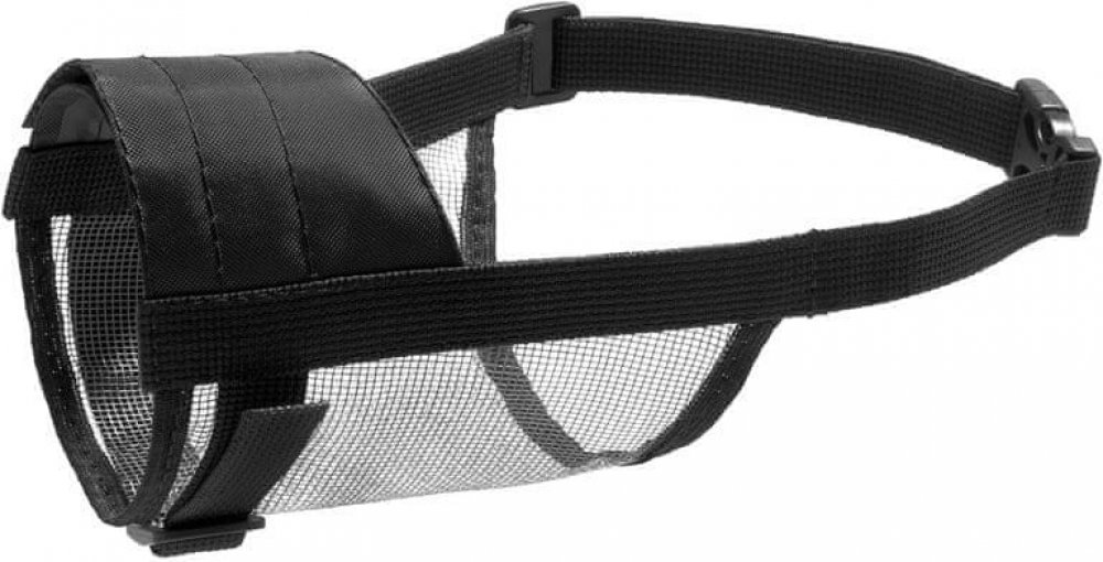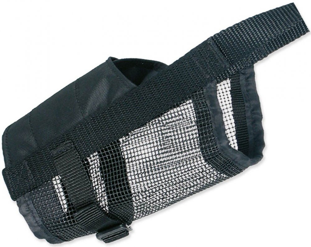 Látkový náhubek pro psy vyrobený z polyesteru. Spodní část je síťovaná pro lepší cirkulaci vzduchu.