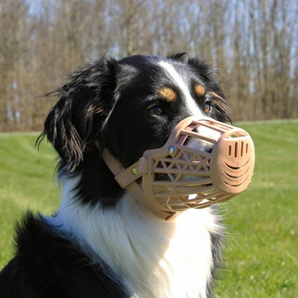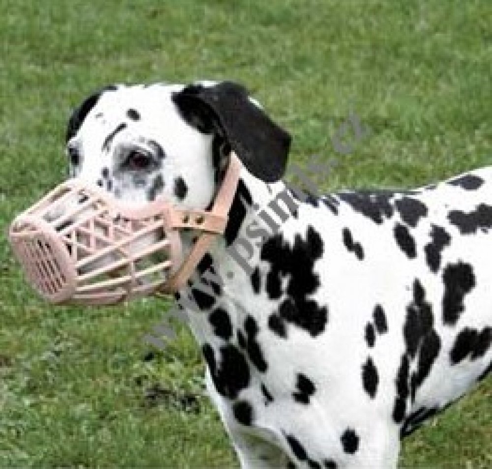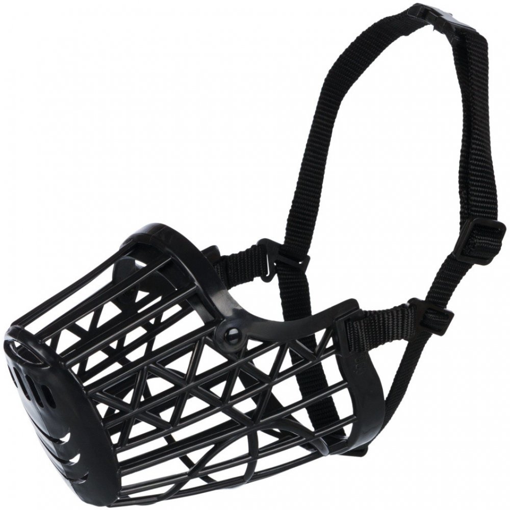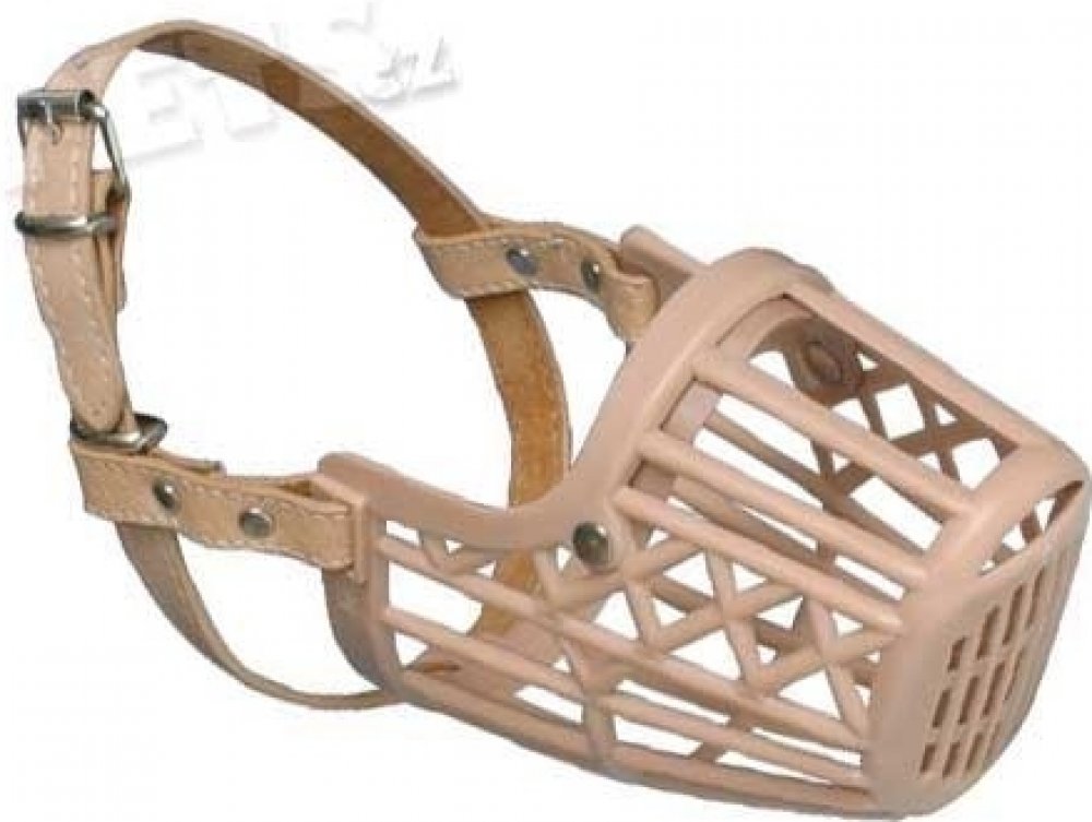Náhubek je vyroben z odolného plastu s koženými řemínky pro upevnění na hlavu psa. Náhubek má husté mřížky a zabraňuje psovi ve žraní nežádoucích nalezených odpadků apod.
